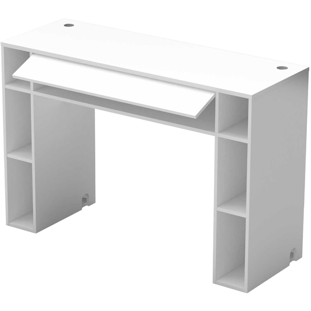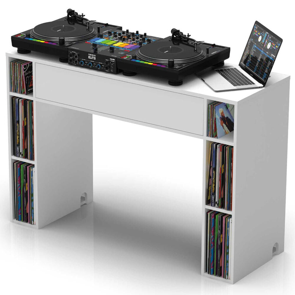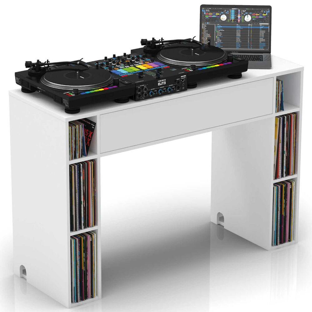 DJs in need of a sturdy DJ table will appreciate the white Glorious Modular Mix Station, a stylish and modern DJ deck that can accommodate two turntables or media players and a DJ mixer up to 14". Up to 200 12" records and 120 7" records can be stored in the six compartments. A hidden shelf can store your amplifier, cables, and other accessories. The upper deck features cable ports to keep your setup looking neat and tidy. The opaque acrylic front panel adds an element of sophistication. An optional LED kit lights up the acrylic panel with various shades of color, adding to the overall aesthetics.