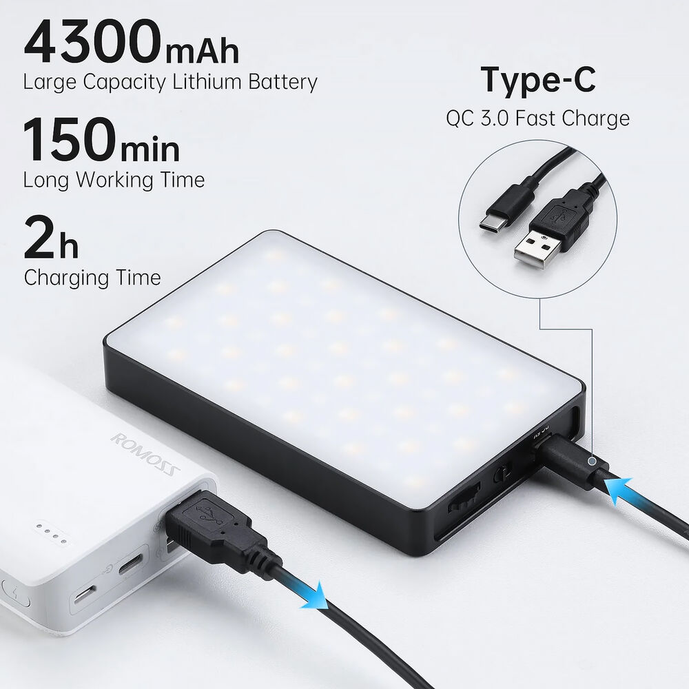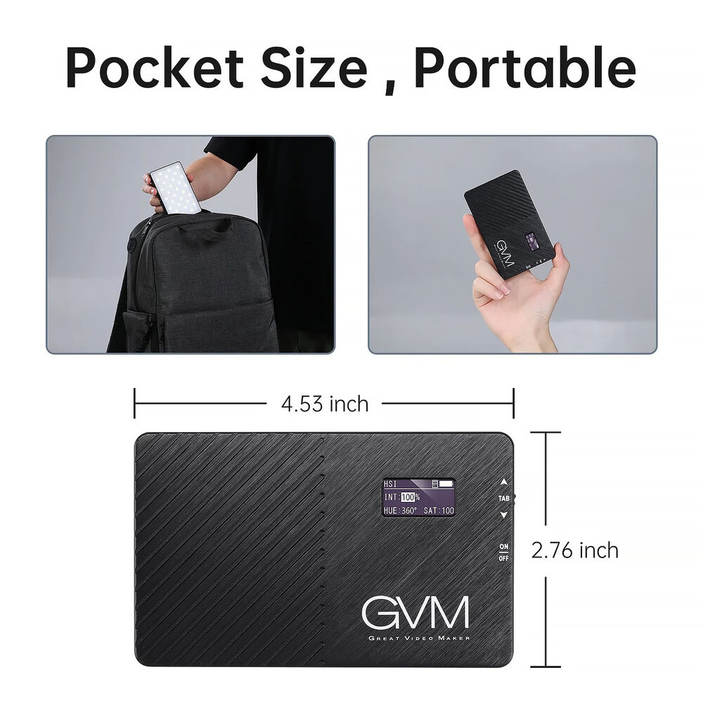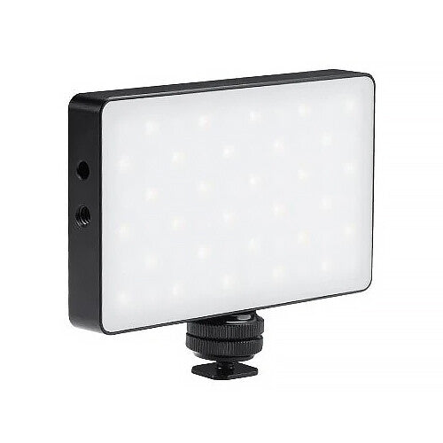 The 8RS RGB LED On-Camera Light from GVM is an ultracompact panel light perfect for mounting on your camera's hot shoe for shooting photos and video. It measures only 4.6 by 2.8" and produces 225 lux at 3.3' with a 120° beam angle, as well as a reliable CRI and TLCI rating of 97. Multiple 1/4"-20 threads make it widely compatible with other equipment and accessories, and the included cold shoe adapter mounts will help you take full advantage of it out of the box. The wide color temperature range of 2700 to 7500K and the RGB settings can both be adjusted using the onboard controls in tandem with the LCD screen, and eight special effects modes add even more creative control to your shooting. The included USB-A to USB-C cable will also help fully charge it in approximately two hours, with a 150-minute runtime once full. Take this pocket-sized light on the go with you, or keep it in your home office or studio to bring your creativity to the next level, even in tight spaces.