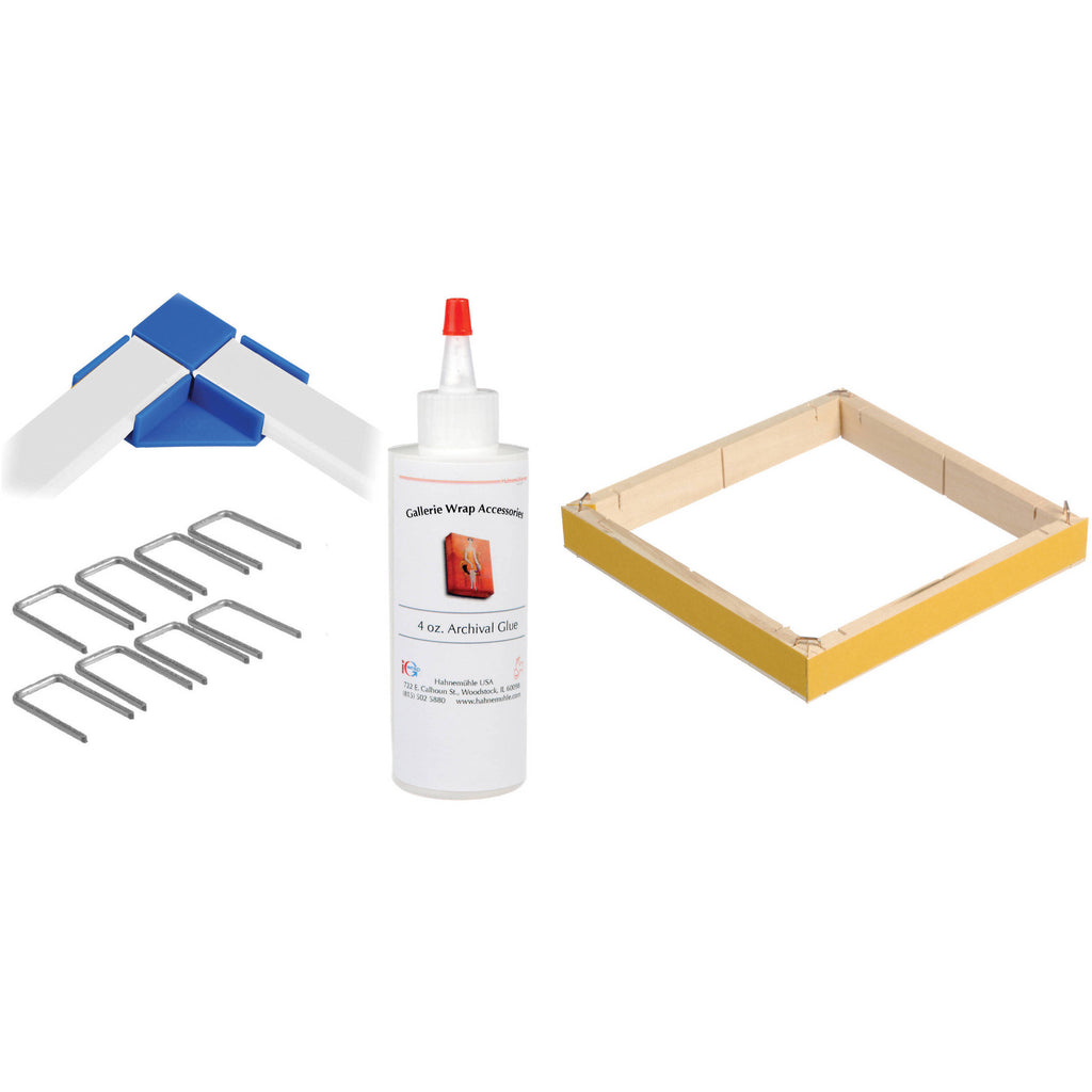 This B&H Kit combines the Hahnemuhle Standard Gallerie Wrap System and the Standard Gallerie Wrap Positioning Corners . This kit includes eight 8" stretcher bars, four plastic corners, a set of pins, and glue. The plastic corner pieces are designed for use with the included stretcher bars to make frames. The corners are used to hold the frame in the correct position when you mount your image. They are 1.25" in depth and designed to work exclusively with Standard Gallerie packages.