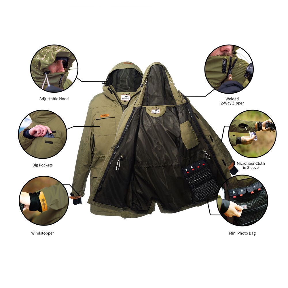 The third layer of this jacket is lightweight, water and wind resistant with a rain column of 6000mm. It is made from tear-resistant 228T nylon-treated fabric. The interior mesh enhances the jacket's comfort and breathability while providing air circulation. The zippers under the arms provide extra ventilation if desired. Additionally, this outer jacket has a welded 2-way YKK zipper for extra water and wind protection. There are also elastic bands in the hood for a more secure fit and wrist wind stoppers to seal the jacket and prevent unnecessary heat loss. You can also tighten the sleeves with the hook-and-loop adjustment. The front side of the hood is cut longer to protect your camera and viewfinder in inclement conditions.