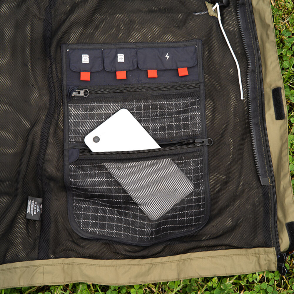 This first layer jacket has eight pockets including five pockets in the mini photo bag. There are two large front pockets and one pocket in the left sleeve with an elastic strap and metal clip for a microfiber cleaning cloth. The mini photo bag in this layer is made from mesh.