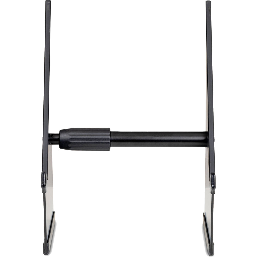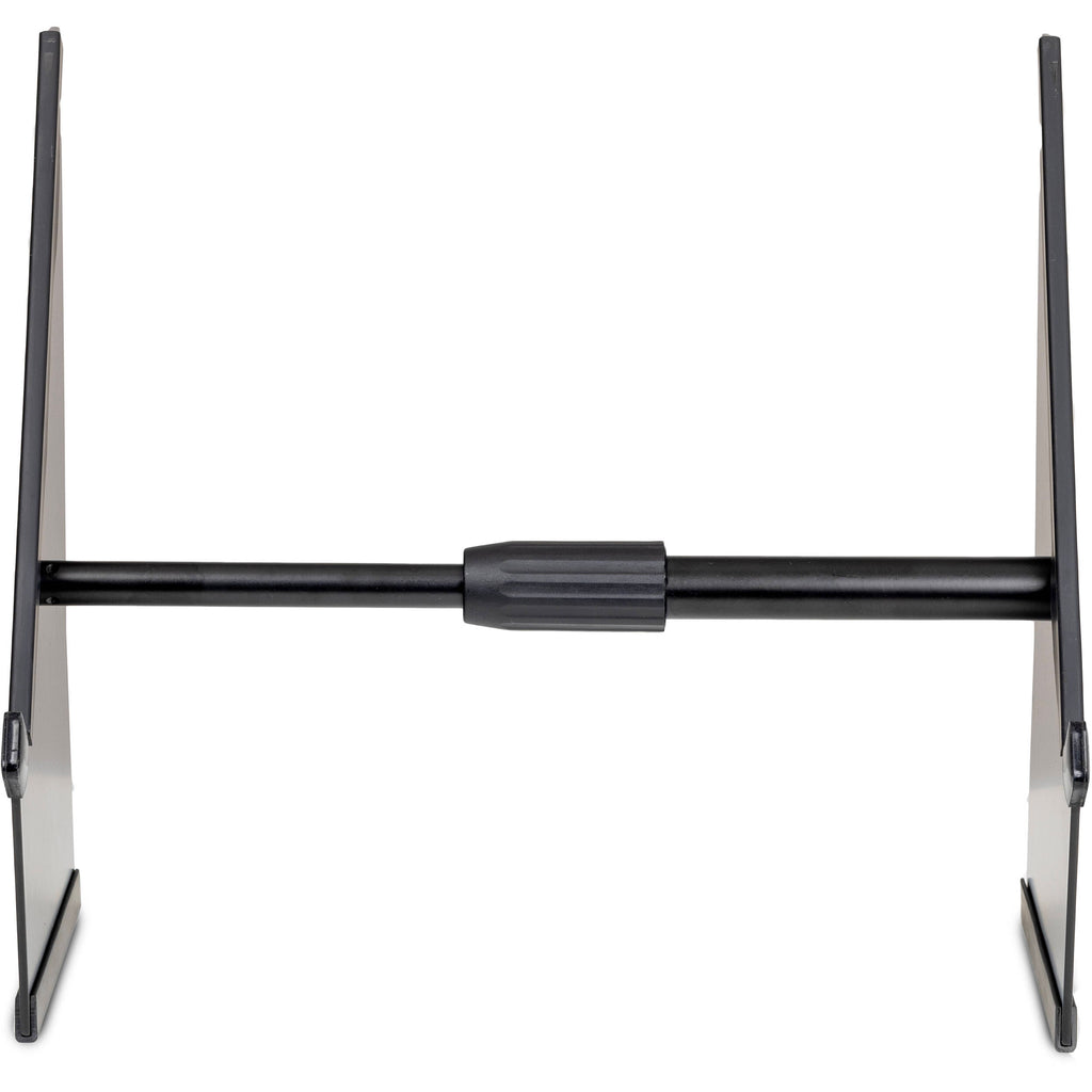 The stand provides adjustable width from 8.25 to 13". The stand is constructed from solid steel for dependability, and nonslip rubber pads keep the stand from slipping on surfaces during use.