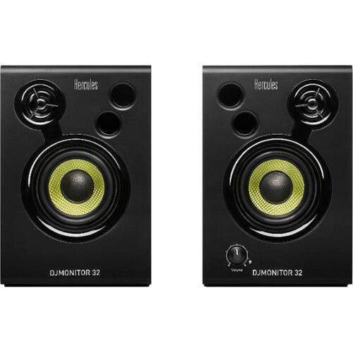 The Hercules DJMonitor 32 Active Multimedia Speakers are sold as a pair and well suited for DJ monitoring applications, project studio recording, laptop audio, gaming consoles, and much more. The DJMonitor 32's design utilizes a powered right speaker that connects to the passive left speaker. The internal amplifier provides 60W of (peak) power to the 3" woofer and tweeter, which combine to offer a frequency response of 60 Hz to 20 kHz. The MDF enclosure is ported for enhanced bass response. The rear of the left speaker features the power plug, stereo RCA inputs, and the terminal block to connect the right satellite speaker. The front of the active speaker features a volume control. The Hercules DJMonitor 32 includes a satellite connection cable and a power cable.