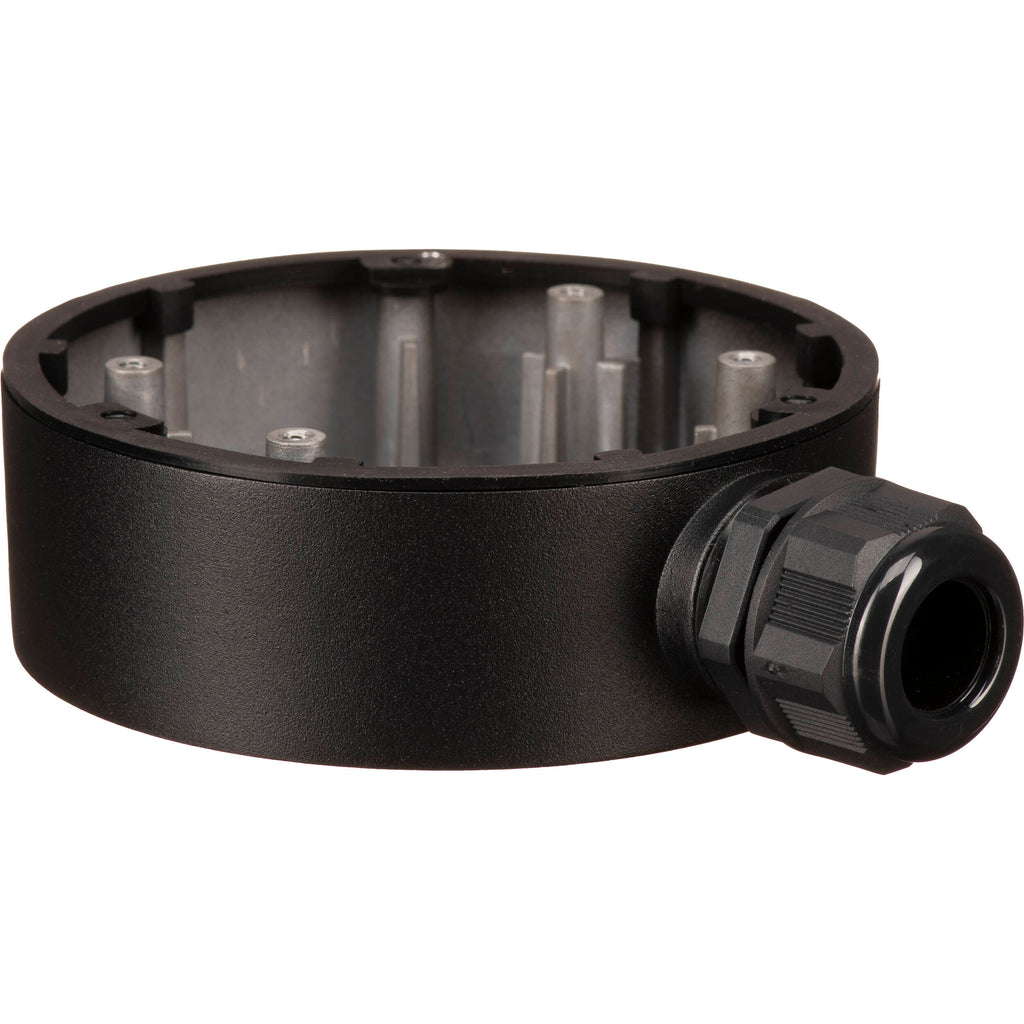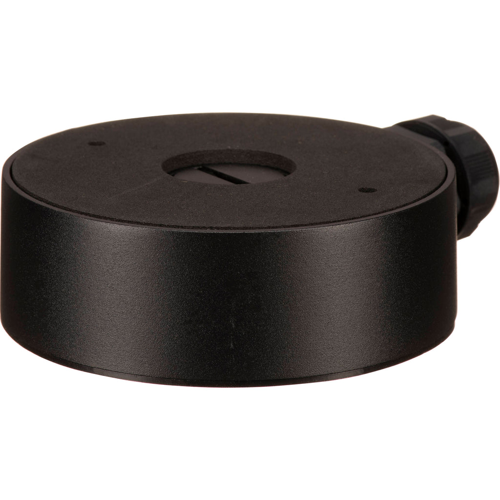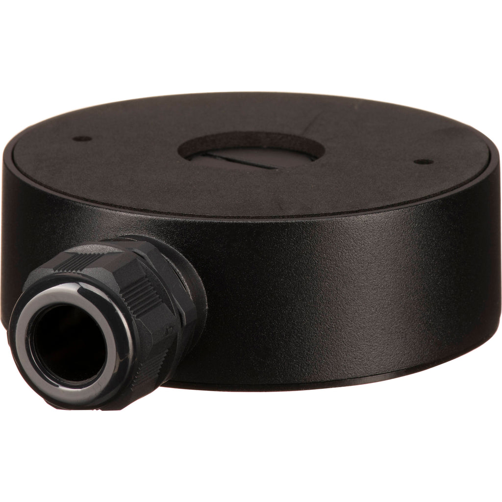 The black CB120B is a conduit base designed for select Hikvision dome cameras. It has a 9.92 lb maximum load capacity when installed on a flat surface or wall capable of supporting at least three times the total weight of the camera and conduit base.