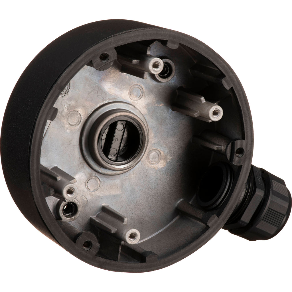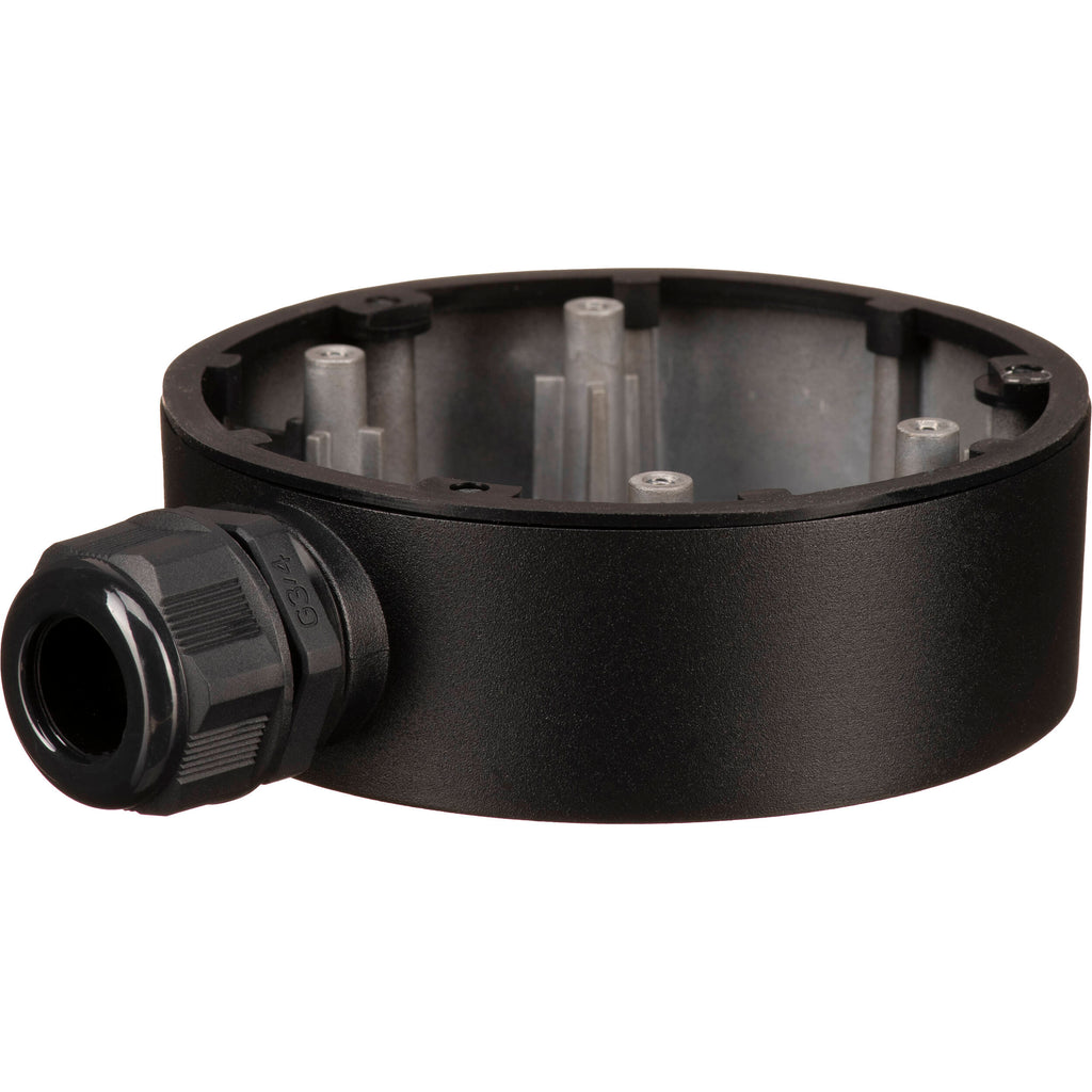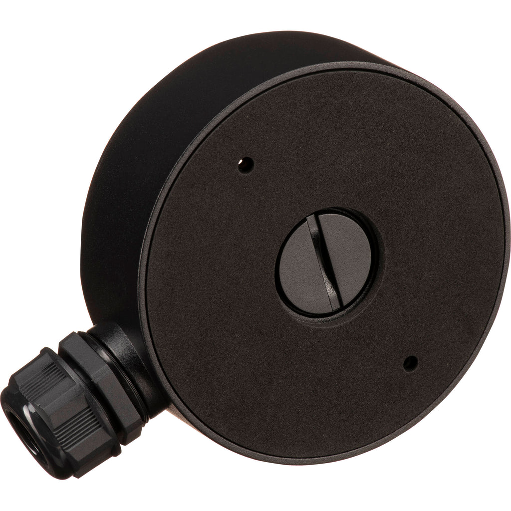 The black CB120B is a conduit base designed for select Hikvision dome cameras. It has a 9.92 lb maximum load capacity when installed on a flat surface or wall capable of supporting at least three times the total weight of the camera and conduit base.