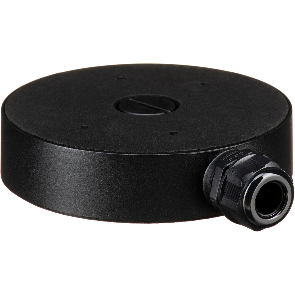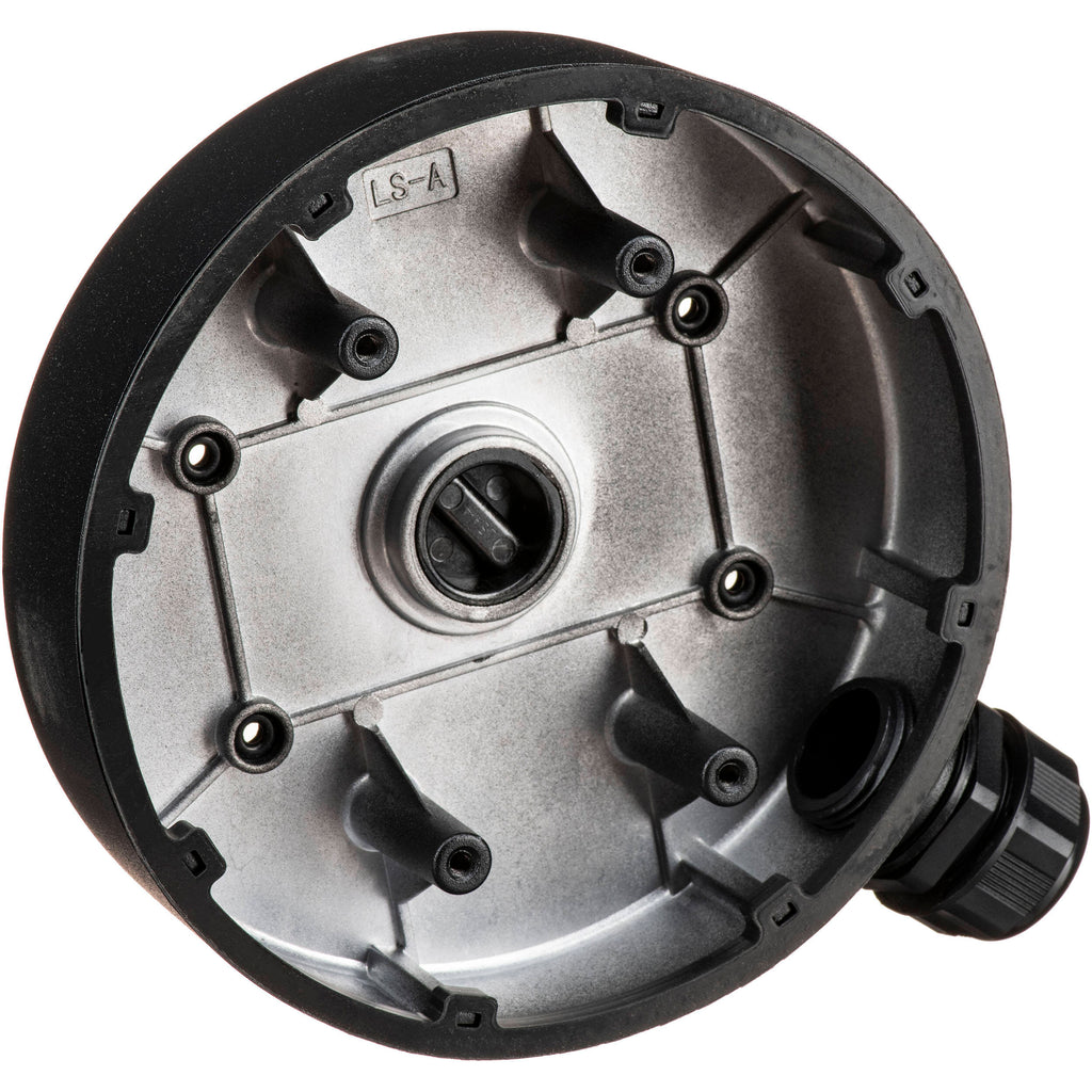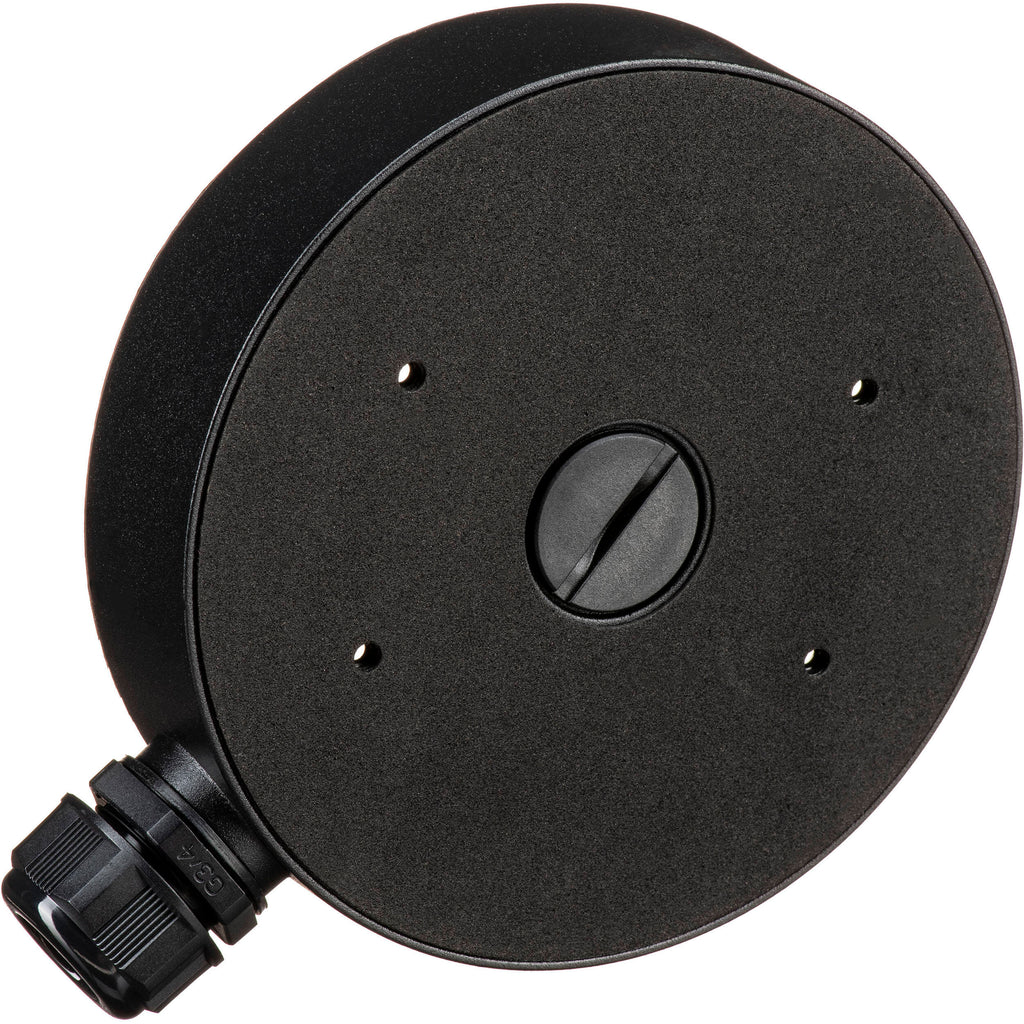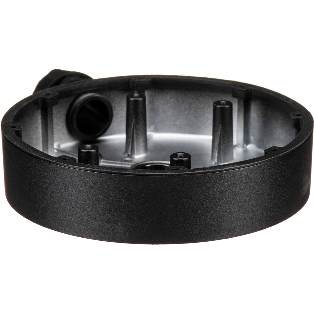 The black CB155B is a junction box designed for select Hikvision cameras. It has a 4.4 lb maximum load capacity when installed on a flat surface or wall capable of supporting at least three times the total weight of the camera and junction box. A waterproof rubber gasket is included for an outdoor installation.