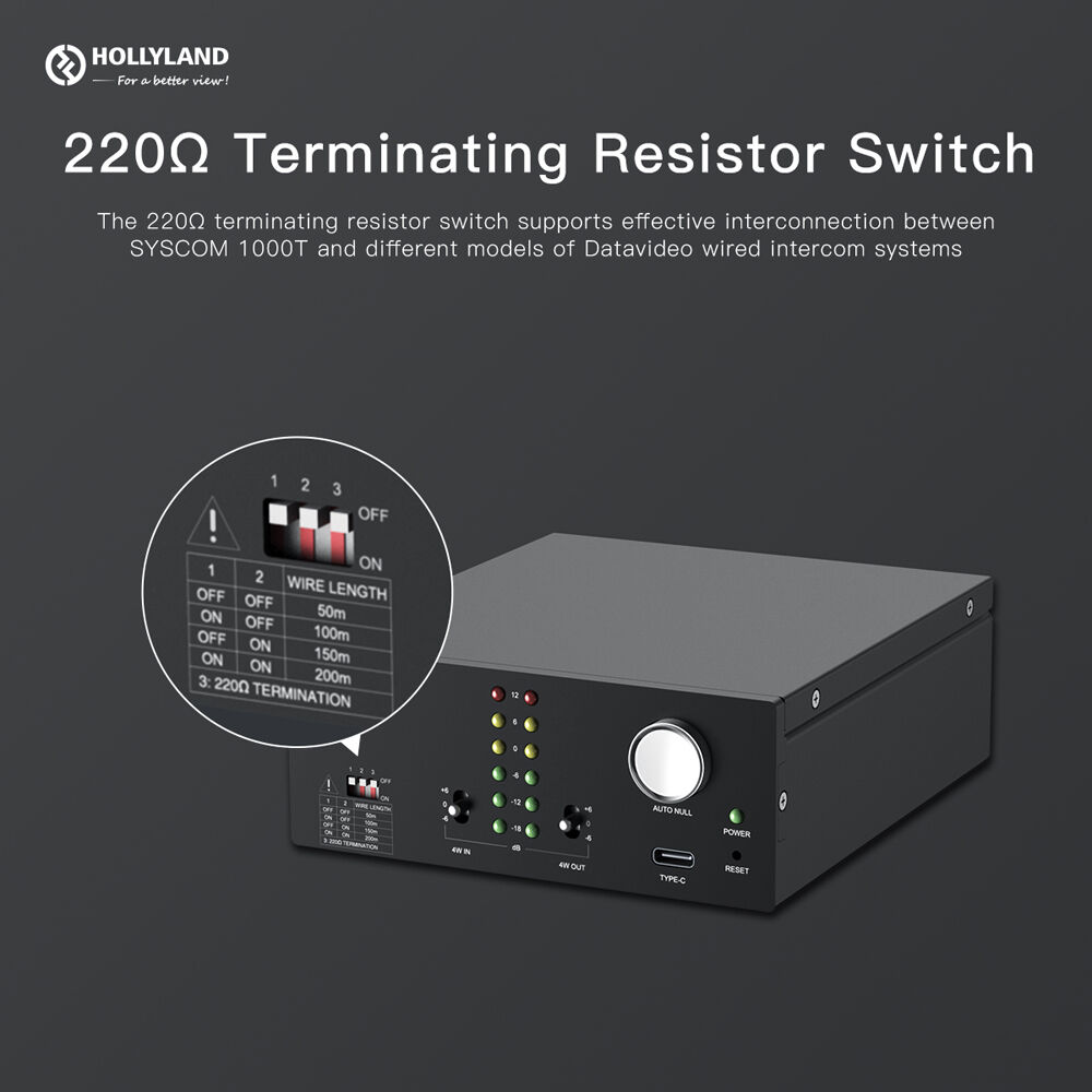 One Button for Echo Processing One button designed for echo processing with the Digital Signal Processing (DSP) technology for echo elimination, easy and convenient 4W Audio Gain Adjustment Ultrahigh ±6 adjustment range to effectively adjust the volume of both the wired and wireless system High-Definition Sound Quality Interconnect with several wired and wireless intercom systems while retaining high-definition sound quality 4-Set Combination for 1 RU Standard Setup Supports standard 1/4 RU structure accessory for 4 sets of 2/4 wire connections for flexible daisy-chain and broader communication coverage 2-Wire Connection for Direct Power Supply Direct power supply from a 12 to 36V 2-wire connection with the wired system, no additional power supply needed Terminating Resistor Switch The 220-ohm terminating resistor switch supports effective interconnection between SYSCOM 1000T and different models of Datavideo wired intercom systems Distance Compensation Switches Two distance compensation switches for easy distance setup to meet up to 656' cable length between the wired system and the converter Voltage and Static Protection The voltage-protection design effectively prevent damage to the equipment by overvoltage input, while an electrostatic discharge (ESD) ±6000V test avoids ESD damage in dry or humid environments Compatibility The 2-wire interface is compatible with ALTAIR, Hanson, ClearCom, RTS, Datavideo, and other types of wired intercom systems UPC: 191460001109Connectors | 1 x 3-Pin XLR 2-Wire, Female 1 x 3-Pin XLR 2-Wire, Male 1 x 3-Pin XLR 4-Wire, Female 1 x 3-Pin XLR 4-Wire, Male 1 x USB Type-C |