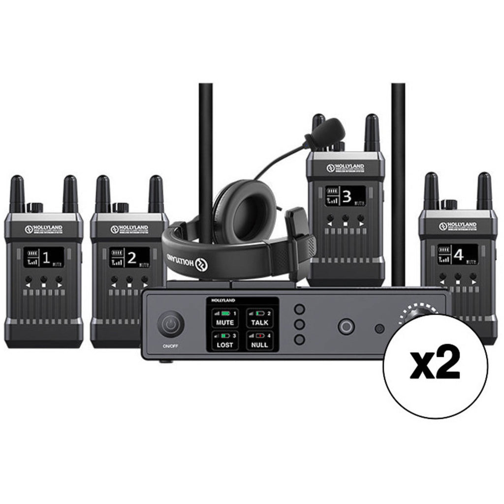 This is a set of two Hollyland Full-Duplex Intercom Systems with Four Beltpack Transceivers useful for live studio production in small or large studios. Each set features a range of 1000 feet. The base station, provides details on each linked beltpack on its large display screen and can individually mute the beltpacks when the base station operator needs to hear what is going on around them. Each set includes a base station, 4 x beltpacks for camera operators, and 5 x headsets.