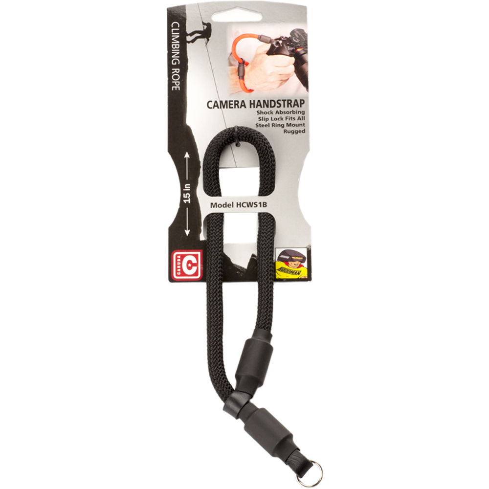 Carry a camera and lens up to 5 lb with the black Climbing Rope Handstrap from Hoodman . The strap is 0.4" thick and features a ring connector. Photographers will appreciate the slip lock one-size-fits-all design.