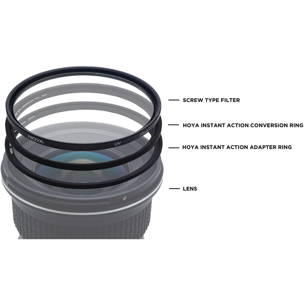 The 55mm Magnetic Instant Action Conversion Ring from Hoya acts as middleman between the filter and the adapter ring, allowing any Hoya (or other brand) filter to magnetically attach to your camera lens. The user must be utilizing the Hoya Instant Action Adapter Ring.