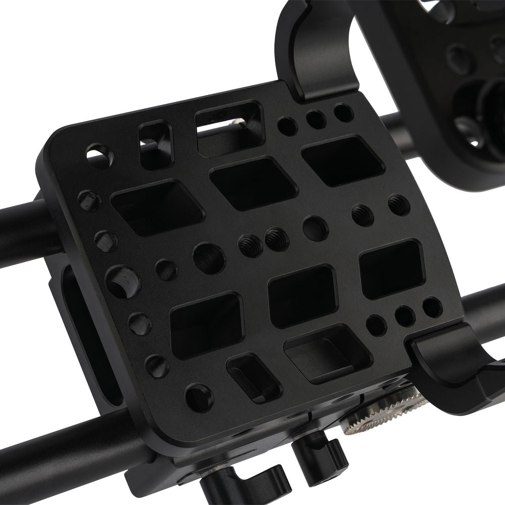 Monitors and small lights can be mounted to the included ELE-ROSEARM or to the cold shoe mount located on the top handle. The bottom rods extend far enough to mount a lens support bracket for long lenses, and the top and bottom rods can both support manual and powered follow focuses. The included ELE-DOVETAIL-9 base plate securely seats the cage body and gives the operator the ability to better balance their load while offering safety measures to assure the camera and rig do not slide loose. There are multiple threaded recesses for accessory attachment.