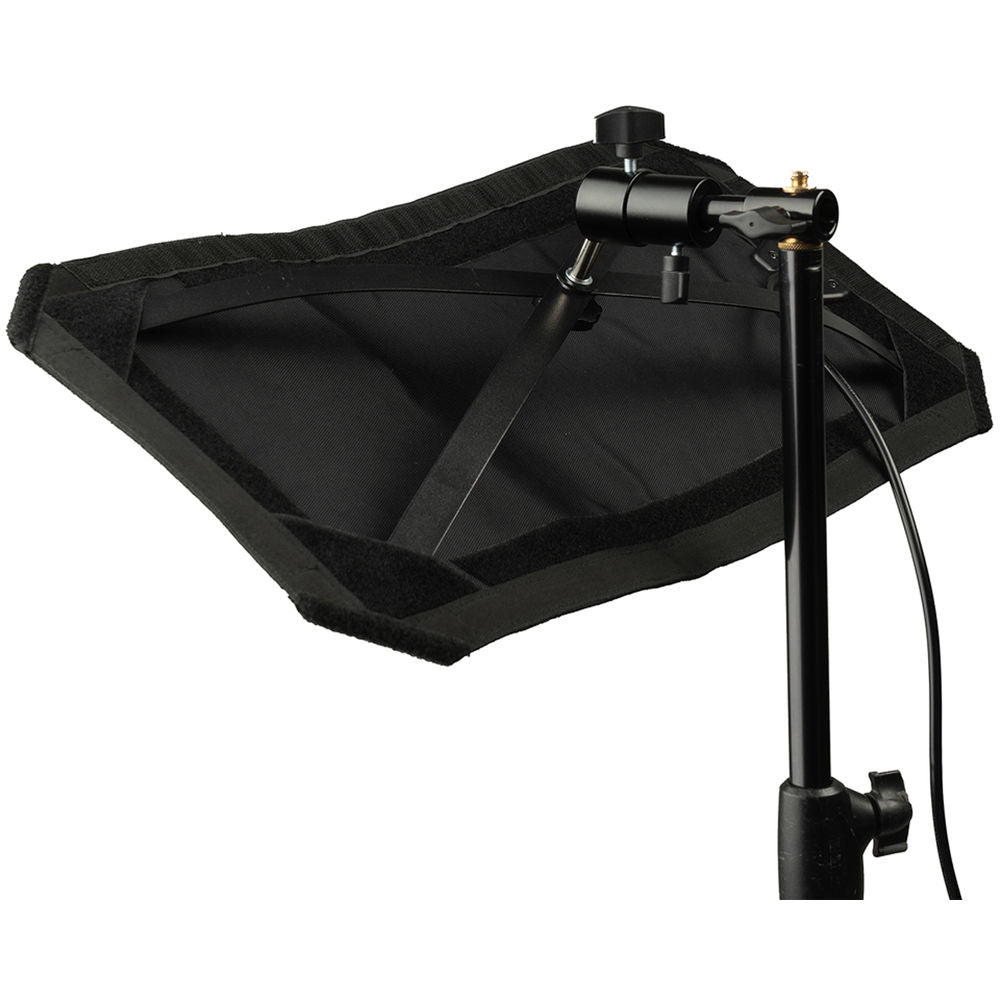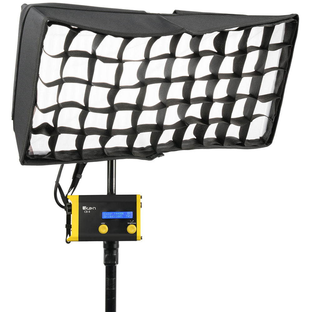 For those who value flexibility but would also like a solid panel, ikan includes an X-Holder and Mounting Pin to hold the mat rigid at its full 20 x 10" spread. The special receiver has a 5/8" hole tapped it its barrel so that it mounts horizontally on a light stand, while the end that connects to the Canvas light rotates about 180° for precise placement. The X-Holder facilitates mounting the included softbox to take the edge off the bright LEDs. There's also a fabric grid that narrows the Canvas light's beam to permit selective lighting.