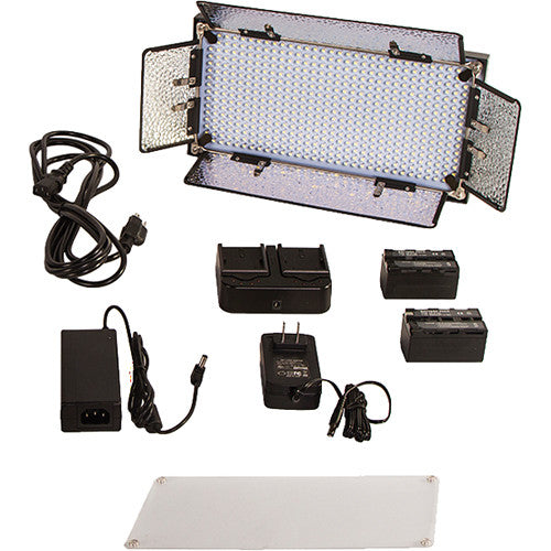 The IB508-v2 is powered by the included multi-voltage AC adapter for worldwide use or by the two provided Sony L-type batteries for use when mains power is unavailable on location. The light also comes with a charger and 5/8" stand mount. Its reflective four-way barndoors not only allow you to contour the light output, but fold flat across the panel to form a protective shell.