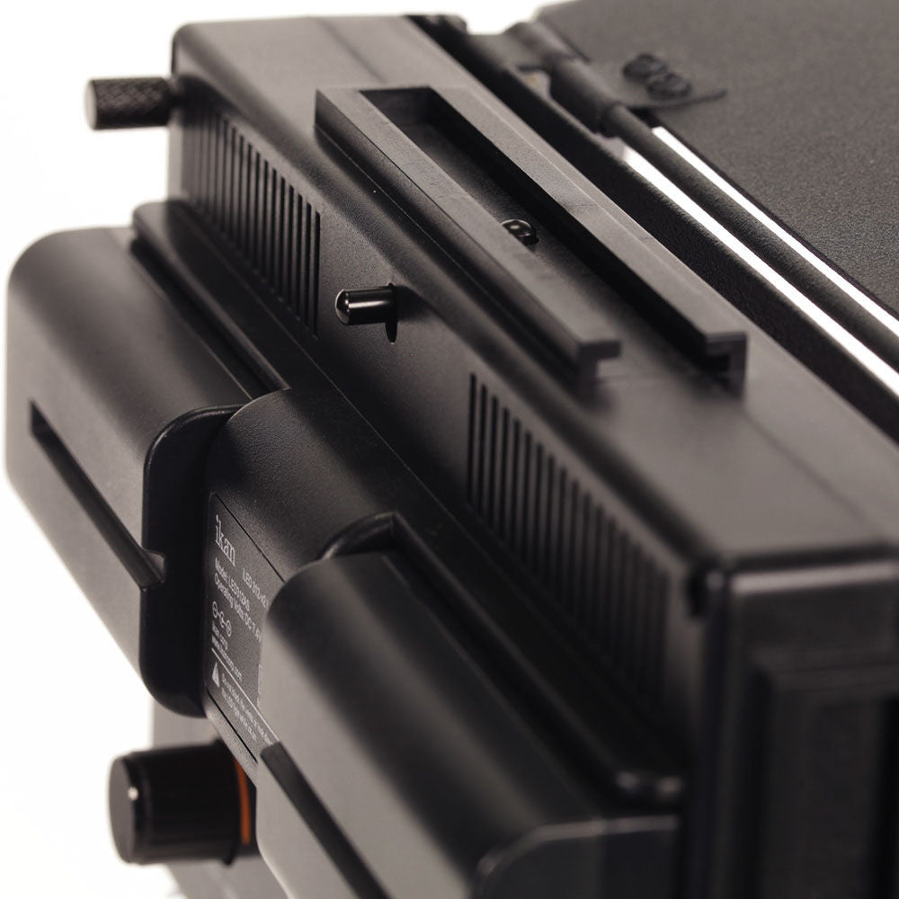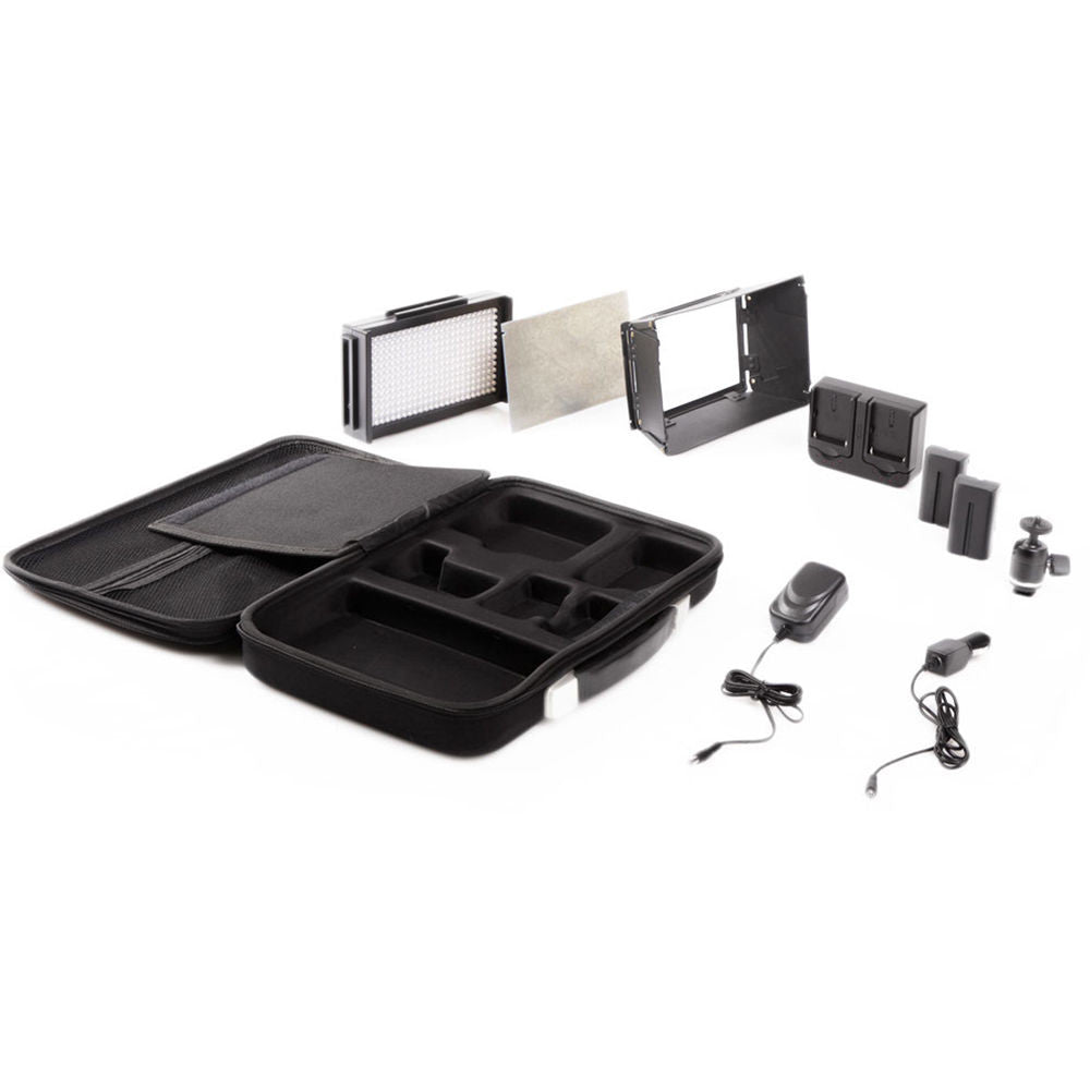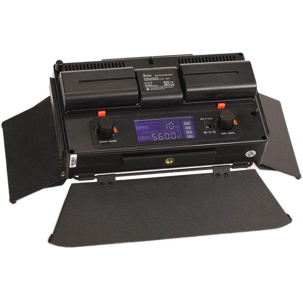 The light produces a 60° beam angle, and includes both a removable four leaf barn door and diffusion gel. The light features slots for two Sony L-Series type batteries, and includes two batteries and a dual battery charger. A 1/4"-20 threaded hole allows you to mount the light to your camera's accessory shoe via the included ball adapter. You can also stack multiple iLED312 lights together using the interlocking rail system. An included soft carry case allows you to easily pack and carry your light unit, gel, barn doors and included accessories to and from shoots.