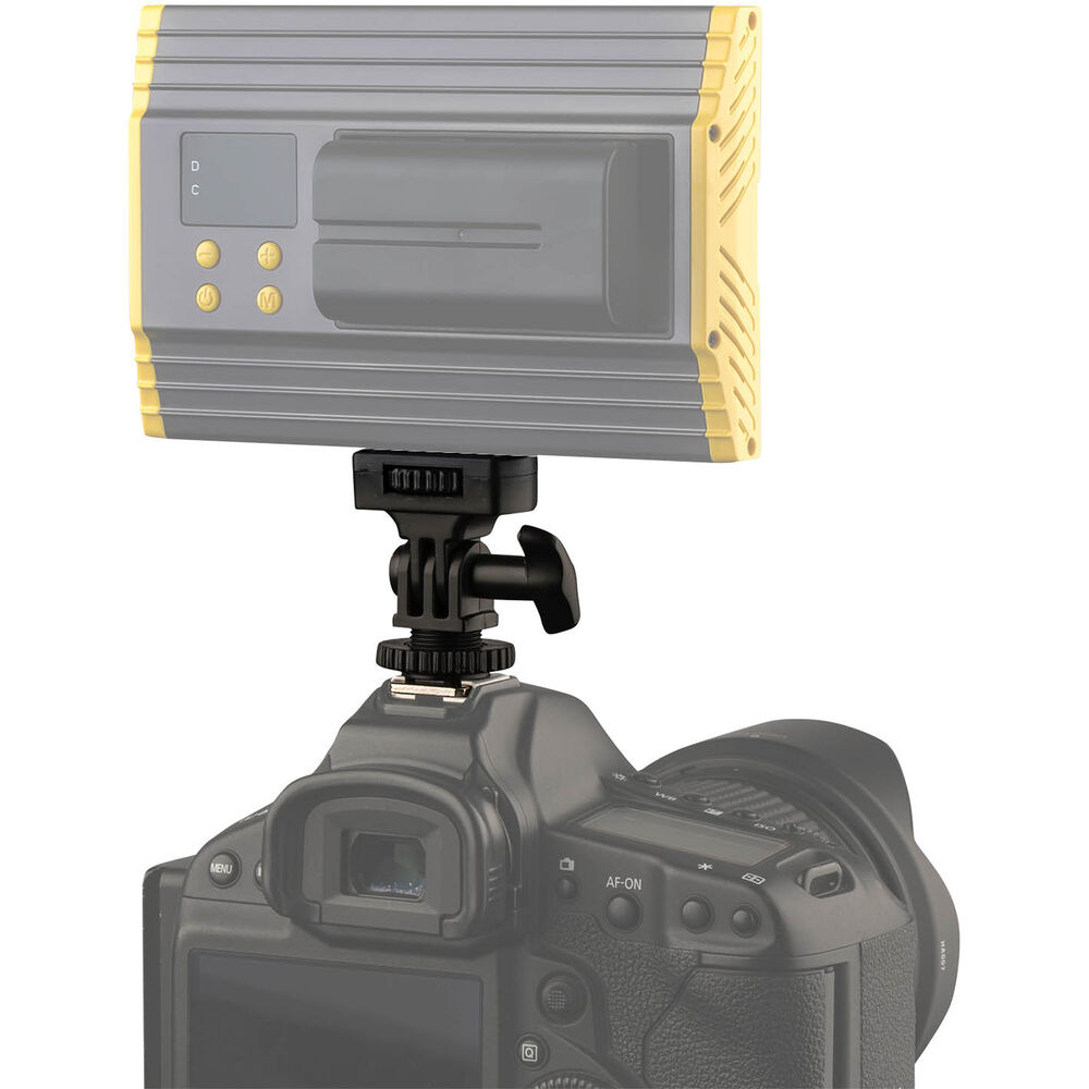 The mount attaches to your camera via the cold shoe, and it has a locking ring to tighten it in place. The bottom of the mount also features an aluminum 1/4"-20 threaded mounting hole for use with articulating arms, stands, and other mounting accessories. Please note that this mount is specifically designed for use with the Onyx 120 or Onyx 240 light fixture and is not rated for use with any other fixture.