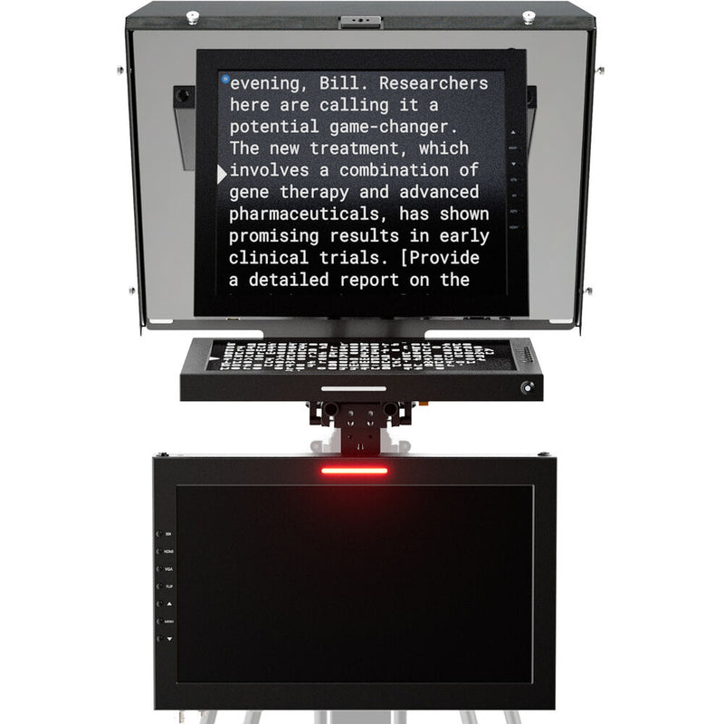 The 15" widescreen talent monitor secures below the main teleprompter via 15mm mounting system to allow talent to see their presentations while live on camera. It features 3G-SDI, HDMI, and VGA input ports, a native 1920 x 1080 resolution, and a maximum brightness of 1000 cd/m². Adjust contrast, brightness, backlight, tint, chroma, sharpness, and each RGB color channel via OSD menu. The aspect ratio can be set as 16:9, 4:3, full, or can automatically detect an aspect ratio and adapt accordingly. When connected to a compatible video switcher, the monitor's onboard dual tally lights lets you know when the camera is live.