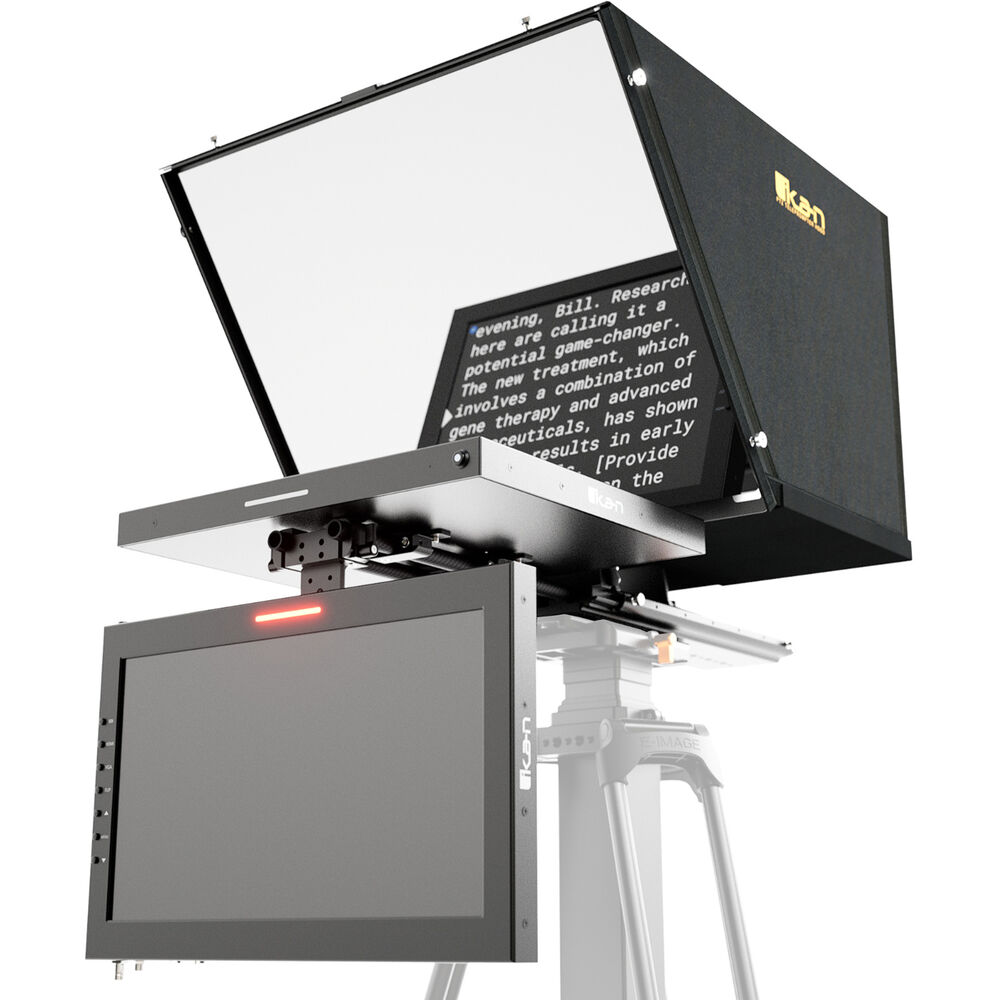 ikan is designed for quick and easy setup in studio or broadcast applications to film professional scripted content with a PTZ camera. The durable aluminum teleprompter includes a 15" monitor, 15" SDI widescreen talent monitor, 65/35 beamsplitter glass, a fully enclosed PTZ teleprompter hood, and an improved base for better balancing. Multiple 1/4"-20 and 3/8"-16 threads on the teleprompter makes mounting it to a tripod or pedestal a breeze. HDMI, SDI, and VGA video inputs are compatible with most video equipment.