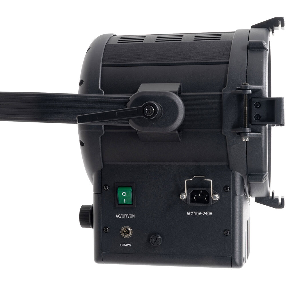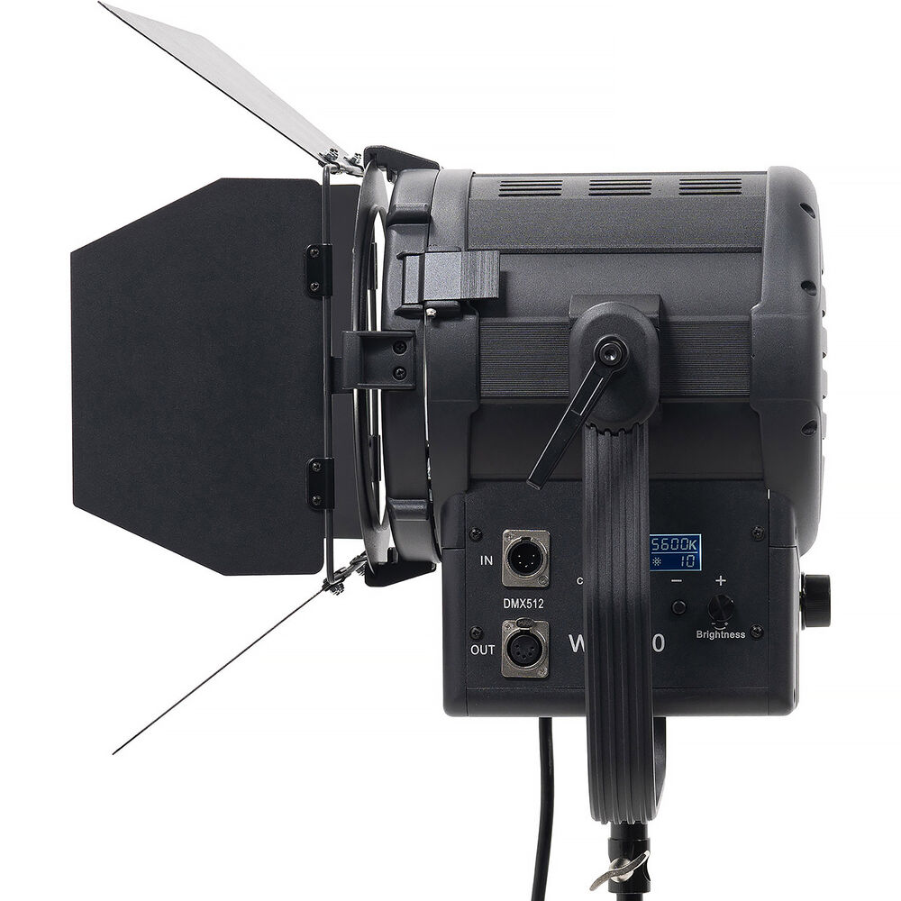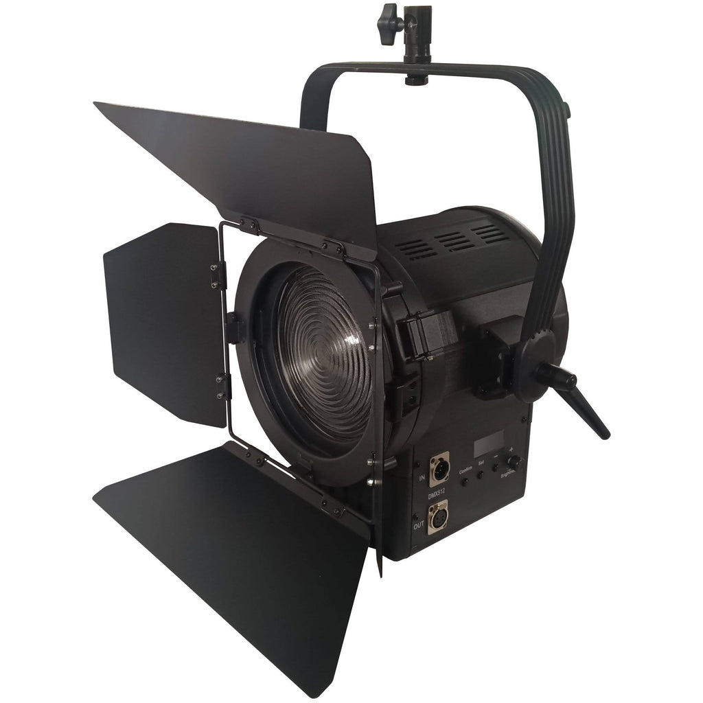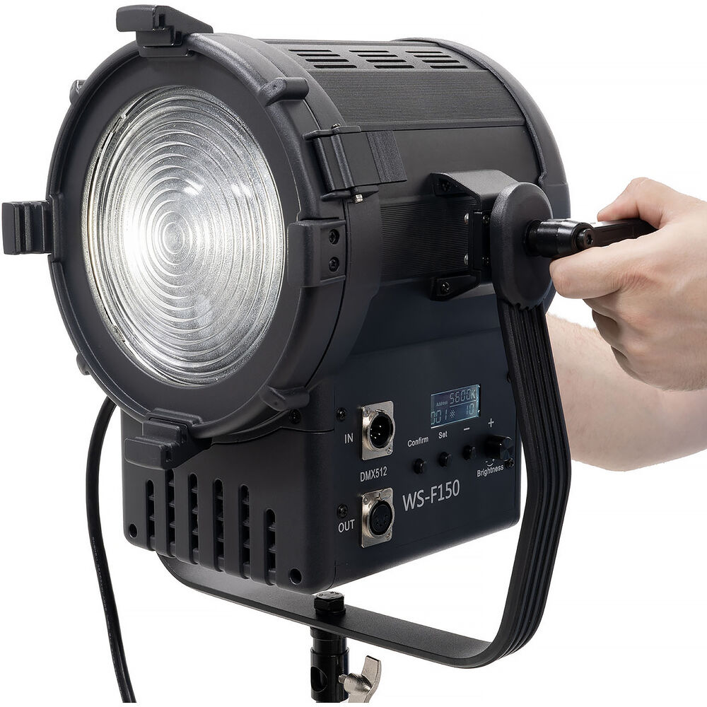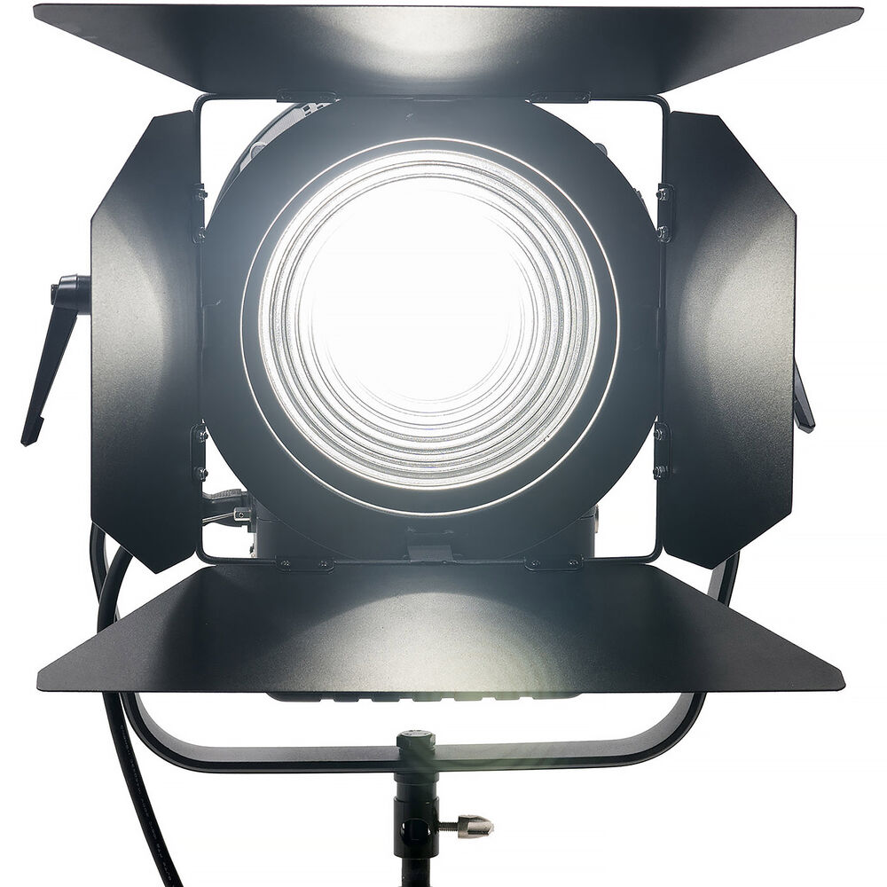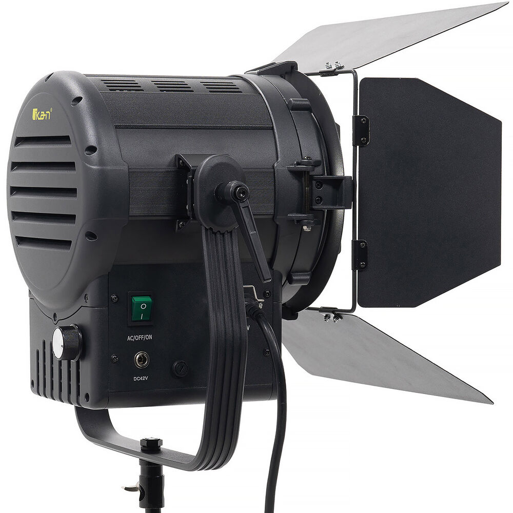 Featuring a 6" Fresnel lens paired with a potent 150W LED, White Star Daylight Fresnel LED Light from ikan is crafted for those desiring clarity, precision, and steady, unyielding light. Emitting a 5600K daylight beam, its CRI 97 color accuracy rating speaks to its faithful color rendering. The focus knob shifts the beam angle from the spotlight 25° to the floodlight 65°, and the light comes with a four-way barndoors modifier to further control the beam. A built-in active cooling system ensures the equipment remains temperate, even after long hours of operation, all while staying quiet enough for studio filming to continue. The frame, made of solid aluminum, stands strong against time and wear. Integrate the light into a larger grid with its 512 DMX in and out ports, with channel selectors and a digital readout adding to its uncomplicated control mechanism.