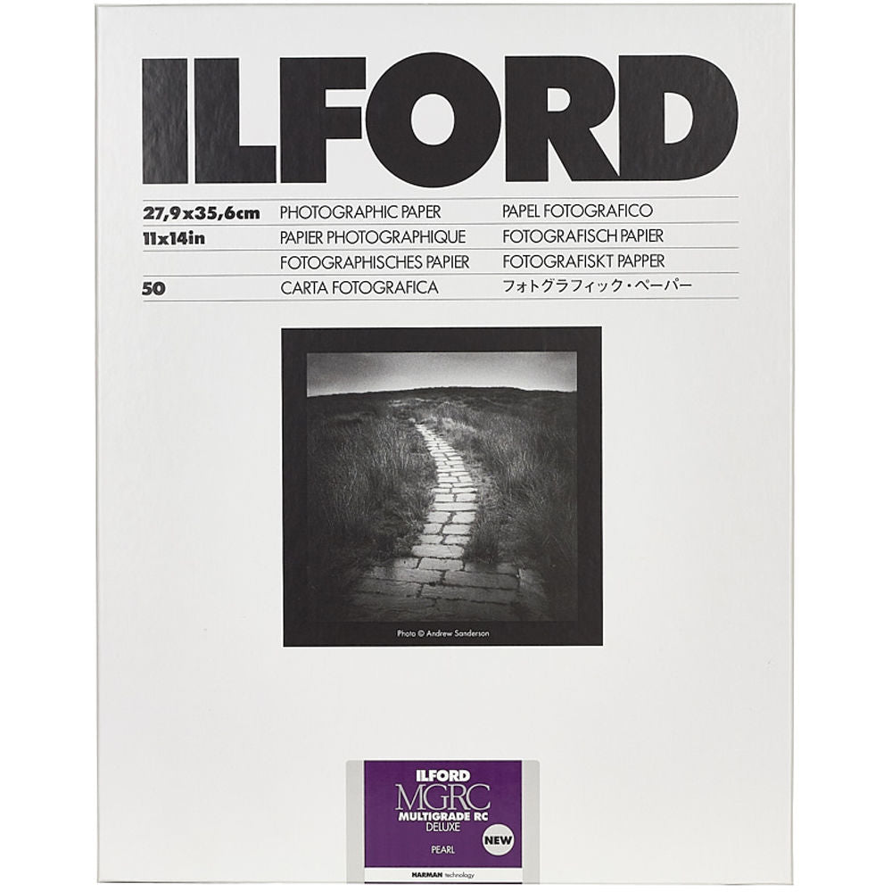 Highly versatile and well-suited for all traditional black and white printing needs, this box of 10 sheets of 11 x 14" Ilford MULTIGRADE RC Deluxe features a pearl 44M surface finish that has a more textured appearance than glossy paper to help reduce overwhelming surface reflections, yet still retains some reflectivity to achieve deeper black values for a longer apparent tonal scale. This Generation V paper features an updated emulsion with a more linear contrast profile that responds consistently and accurately to the full 00-5 range of Multigrade filters for fine tuning the look of prints. The paper also features a truly neutral base tint and responds especially well to different toning solutions for adjusting the final print color. The enhanced emulsion also affords deeper blacks along with enhanced mid-tone separation for greater flexibility when printing negatives of varying densities. Additionally, it is suitable for printing both conventional black and white negatives as well as chromogenic black and white negative films and the paper can be processed using standard black and white chemistry in either trays or using machine processors.