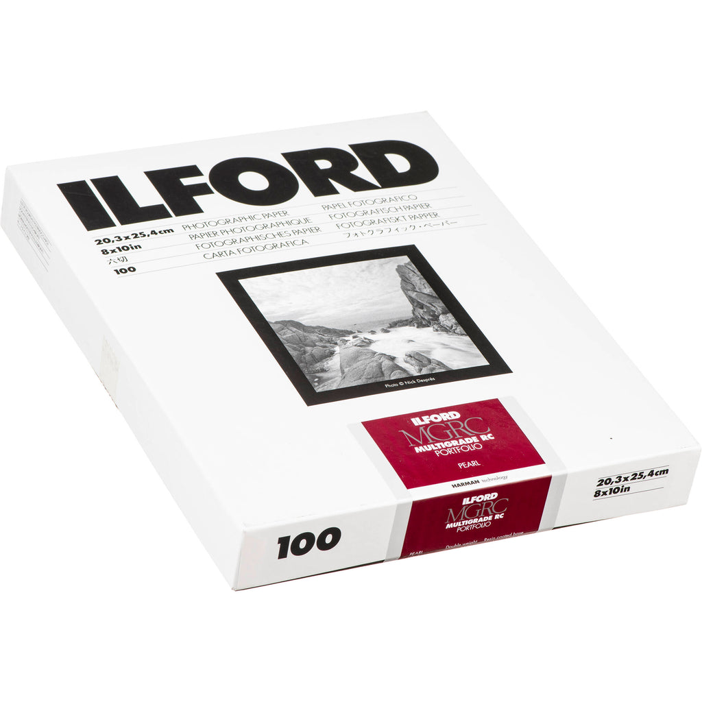 A versatile black and white paper that is well-suited to showcasing your work, this box of 100 sheets of 8 x 10" Multigrade V RC Portfolio Paper from Ilford features a pearl 44K surface finish that has a more textured appearance than glossy paper to help reduce overwhelming surface reflections, yet still retains some reflectivity to achieve deeper black values for a longer apparent tonal scale. Compared to the standard range of medium weight RC papers, this heavyweight Portfolio paper has a 255 gsm base for a sturdier structure that is ideal for exhibiting or for use in presentation books. Its bright white base tint delivers a cool-to-neutral image color, and it responds well to select toners, especially selenium, for increasing the effective print lifespan. As a variable contrast paper, it responds to seven full grades of contrast during printing, when using multigrade filters, and it is suitable for printing both conventional black and white negatives as well as chromogenic black and white negative films. Additionally, the paper can be processed using standard black and white chemistry in either trays or using machine processors.