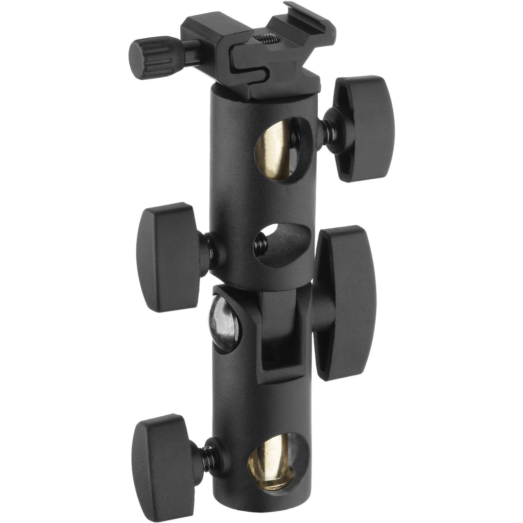 Able to tilt 180-degrees and swivel 360-degrees, the anodized black aluminum Umbrella Mount can be installed on any industry-standard light stand with a 5/8" top stud from either end of the mount. Additional 5/8" holes are tapped into to unit to allow you to mount it vertically or horizontally for maximum versatility. The Deluxe Umbrella Mount includes removable 3/8"-16 and 1/4"-20 brass stud adapters to support accessories. One of them, for example, fastens a cold shoe with a knurled locking knob for a secure connection to your flash.