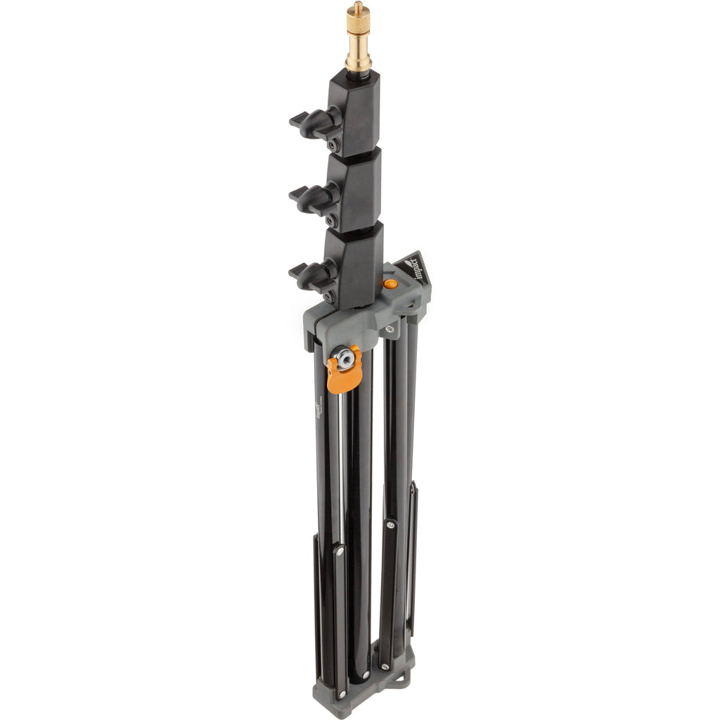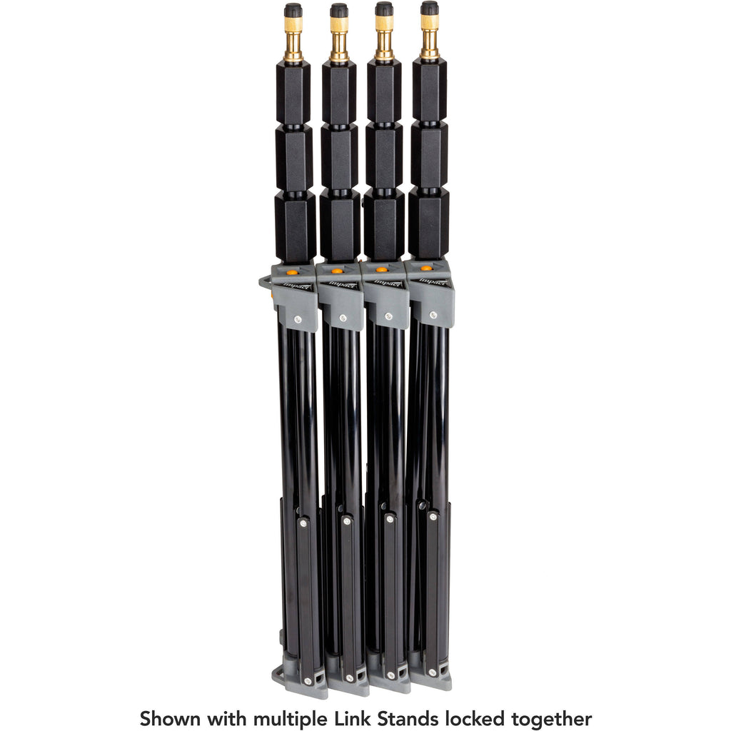 This 7' Link Air-Cushioned Stand from Impact is a standard general-purpose light stand with a unique difference. This stand folds flat and has a locking mechanism with a release button, so it can be locked together with additional stands. When linked together, several stands can be easily carried with one hand. This makes them easy to travel with and store because they take up minimal space when interlocked.