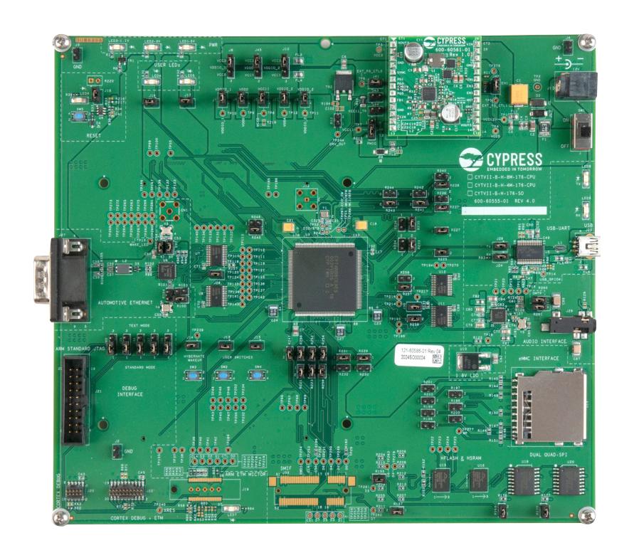 CYTVII-B-H-8M-176-CPU is a CYT4BF TRAVEO� ARM® Cortex®-M7 MCU 32bit embedded evaluation board. The CPU board is meant to be used along with a Traveo II base board (CYTVII-B-E-BB). The base board brings out all important interface connections such as CAN, LIN, SPI EEPROM, CXPI, and Flexray, and can be used in conjunction with several CPU boards of the Traveo II family. The CPU board is shipped with a 12V DC power adapter. This adapter can be plugged into the AC mains supply anywhere in the world and is designed to receive 100-240V AC V at 50/60Hz. While powering the board, you must connect only the power adapter supplied with the evaluation-board and not any other part.