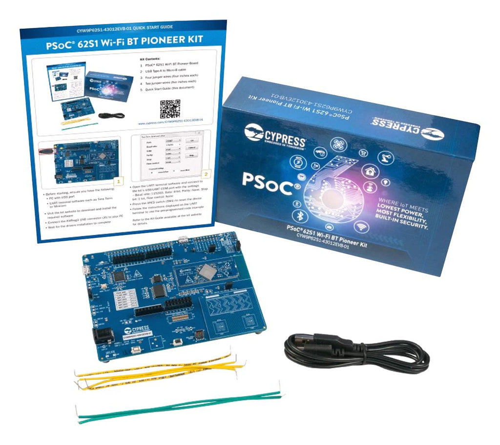 PSoC 62S1 Wi-Fi BT pioneer board, USB type-A to micro-B cable, Four jumper wires (4 inches each), Two jumper wires (5 inches each), Quick start guide.