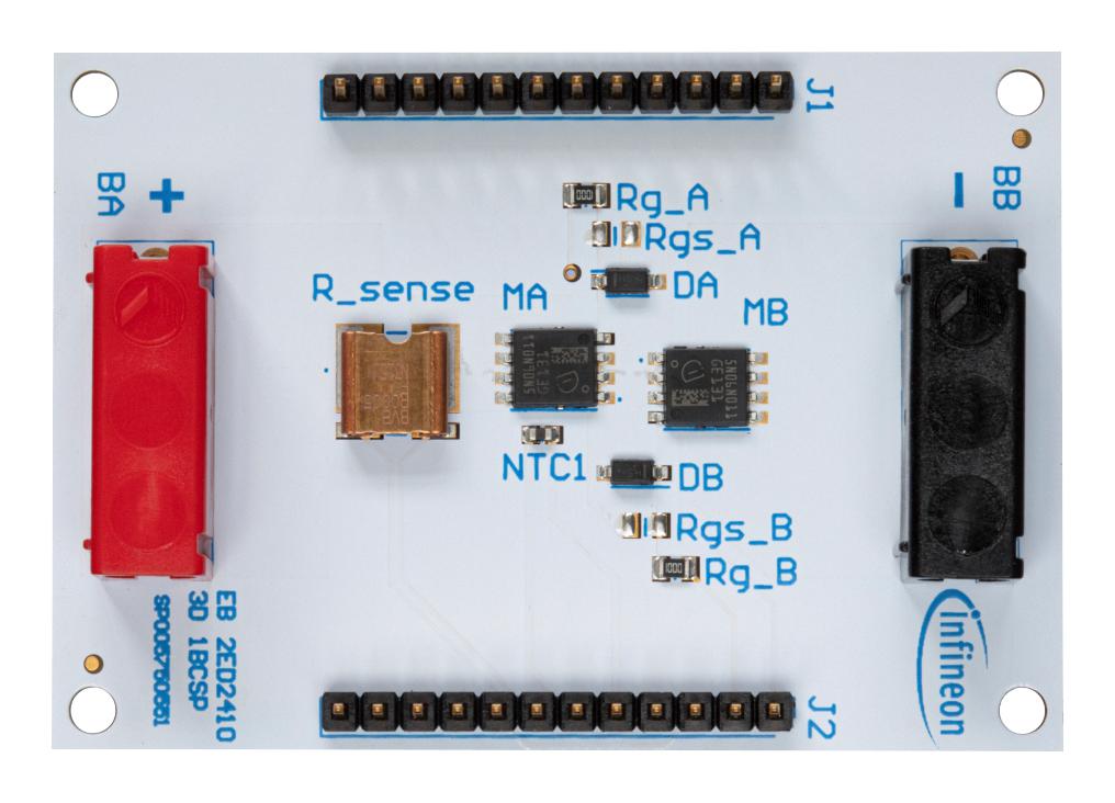 EB2ED24103D1BCSPTOBO1 is a EiceDRIVER� APD 2ED2410-EM - 24V evaluation MOSFET daughterboard, common source, pre-charging. This daughterboard belongs to a family of evaluation boards that can be combined with the 2ED2410-EM 24V evaluation motherboard (EB 2ED2410 3M). These daughterboards are used to address different MOSFET and shunt arrangements typically found in modern automotive power distributions for 12 and 24V board nets. This daughterboard EB 2ED2410 3D 1BCDP is addressing one load channel and consisting of two 60V OptiMOS� 5 power MOSFET (1.1mohm) in a back2back common source configuration. In addition, the load could be pre-charged with a dedicated pre-charge path.