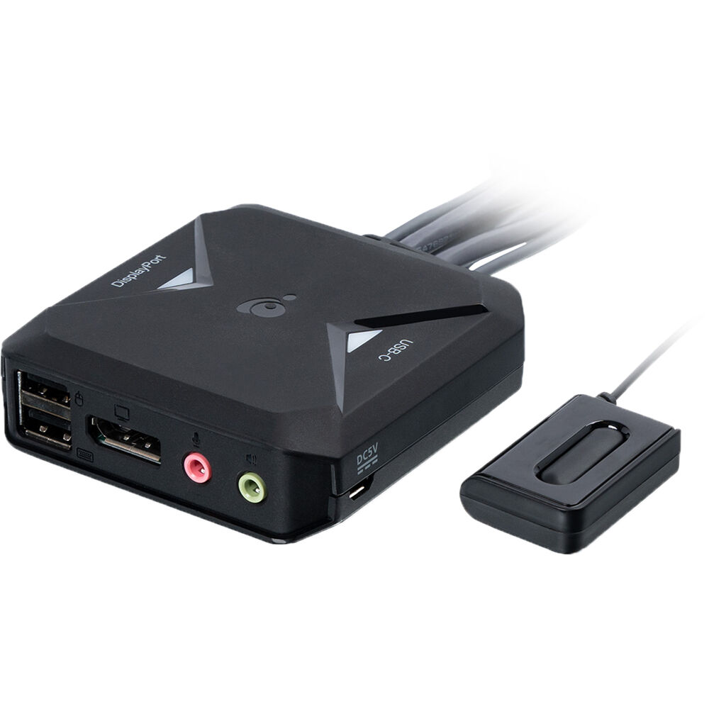 Sporting a small footprint and integrated cable design, this KVM can easily rest on your desktop and provides you with an integrated remote so you can switch systems quickly. Two USB Type-A ports, DisplayPort video output, and dual 3.5mm audio jacks support your mouse, keyboard, display, and audio devices respectively. The KVM features two sets of cables. One set offers a DisplayPort, USB Type-A, and two 3.5mm audio connectors while the secondary set gives you a USB Type-C and two 3.5mm audio connectors, ideal for desktop and notebook setups. This KVM can support display resolutions up to 4096 x 2160 with a refresh rate up to 60 Hz, giving you a clear and smooth picture suitable for work and enjoying your favorite media.