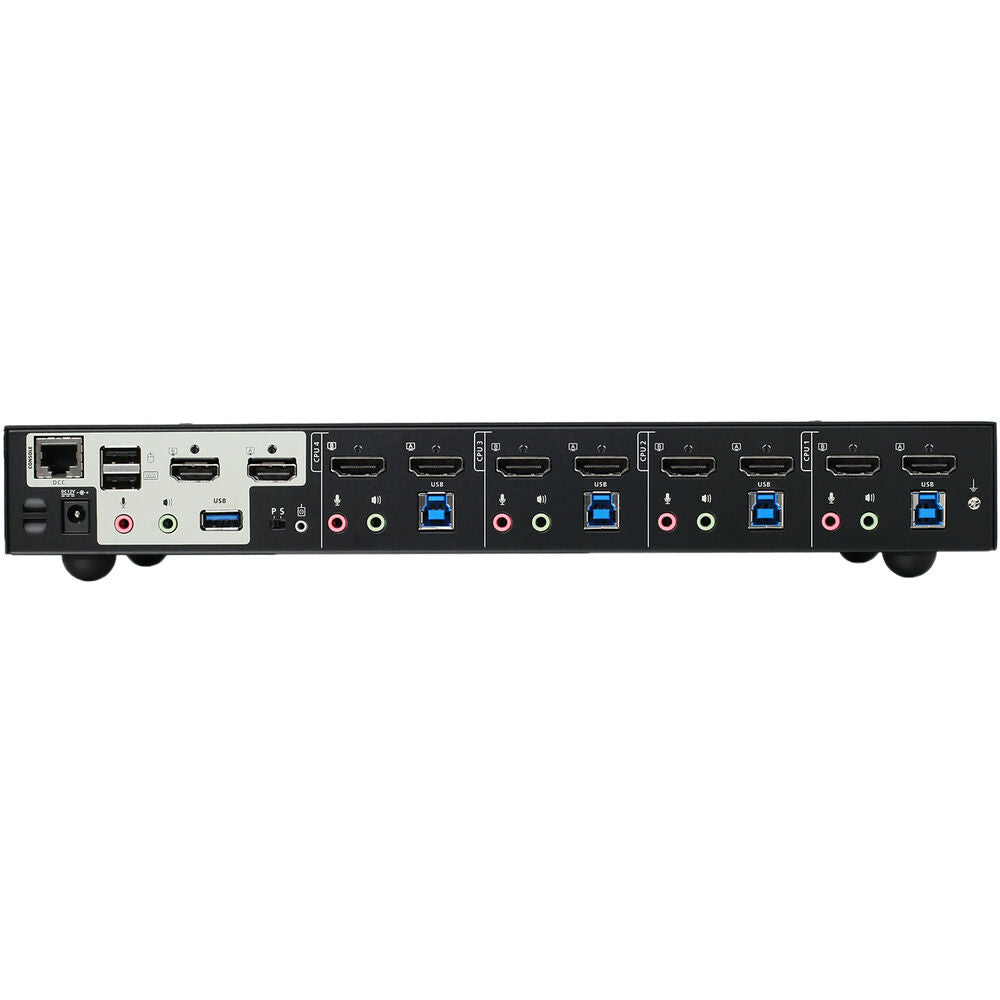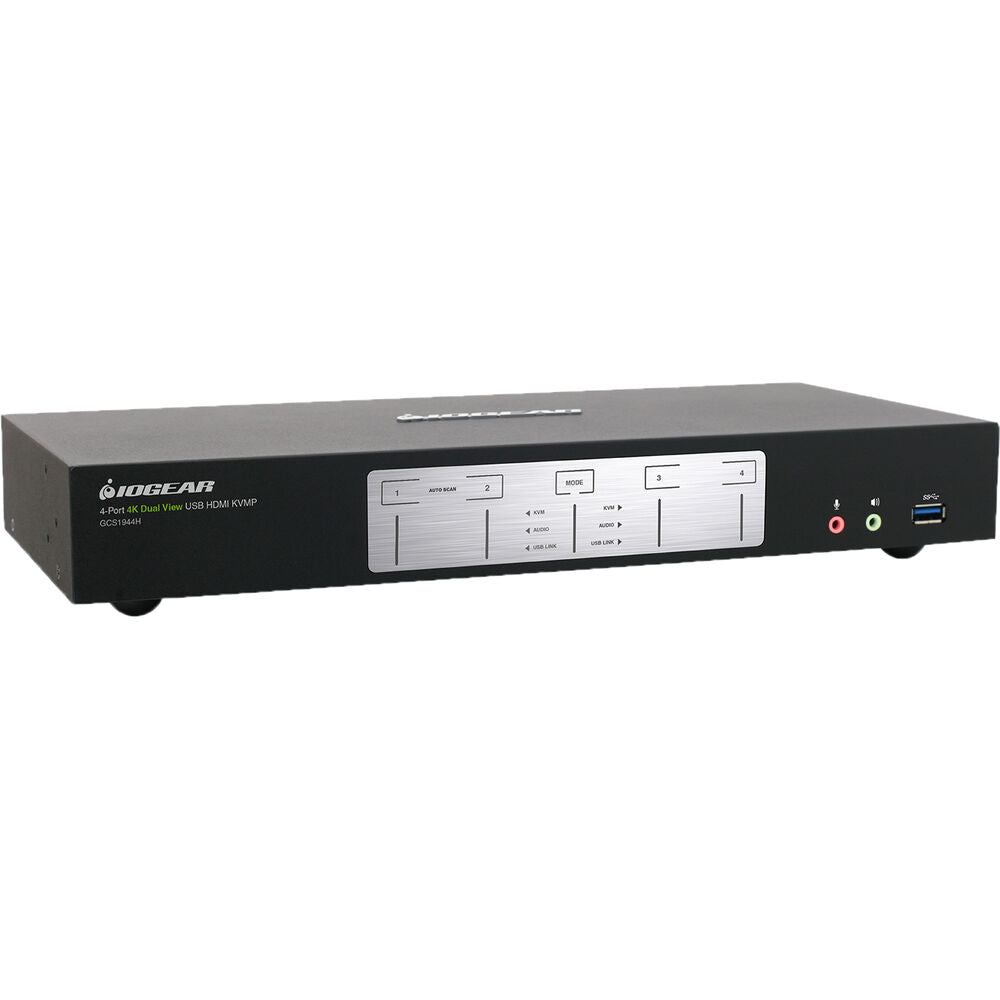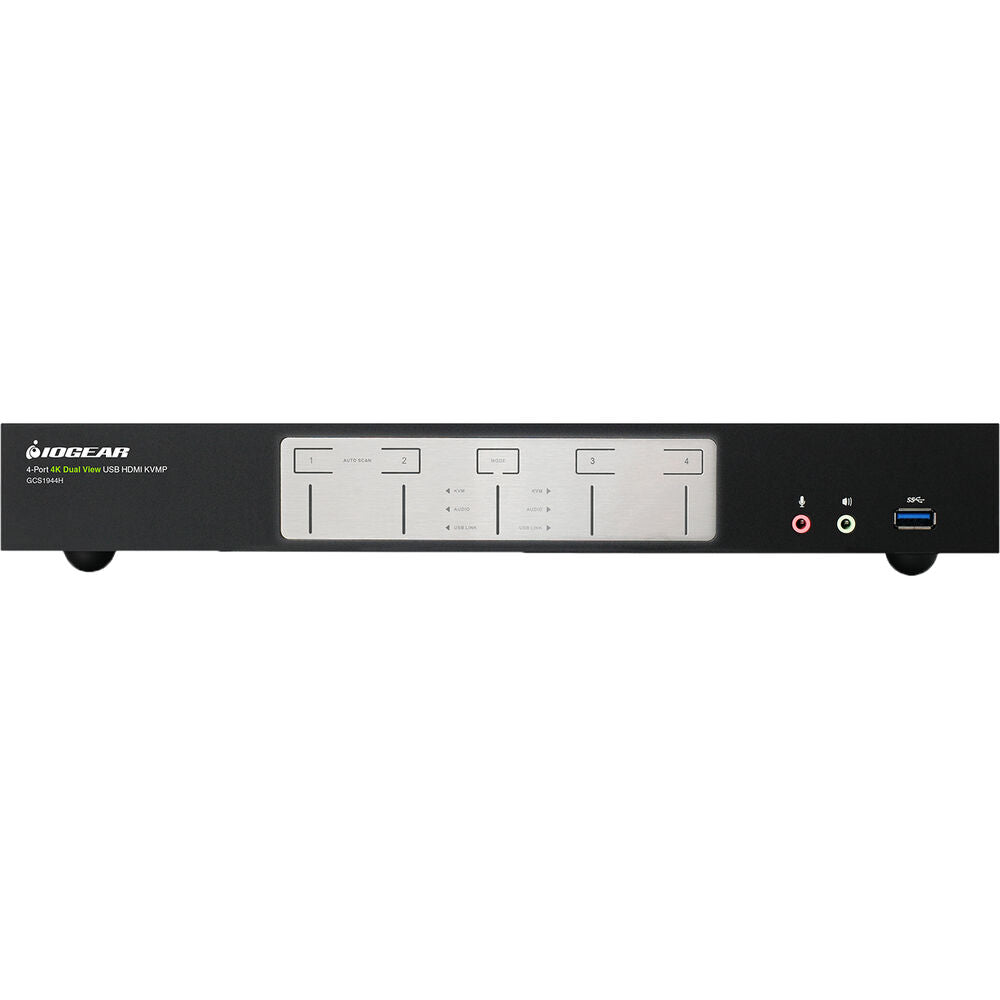 Maximize your workflow with the 4-Port 4K Dual View HDMI KVMP Switch from IOGEAR. With TAA-compliant KVMP to operate up to four HDMI-compatible computer systems using a single mouse, keyboard, and speaker setup. Connect up to two 4096 x 2160 resolution, 60 Hz 4K monitors to enhance your multitasking efficiency with more space for windows, applications, and large projects. Daisy-chaining an additional KVMP switch using the integrated RJ45 port enables support for up to four monitors. There are also 3.5mm ports located on the front and rear of the device for headphones and microphones with support for 7.1 audio. Use the dual-port USB 3.1 Gen 1 hub to share peripherals between systems, including printers, flash drives, and more. You can switch between computers using the device's front panel buttons, keyboard hotkeys, or by pressing the wheel on your compatible three-button mouse. This device is designed to work with Windows 7 or later, Mac, and Linux systems, and includes all KVM and audio cables along with a remote port selector.