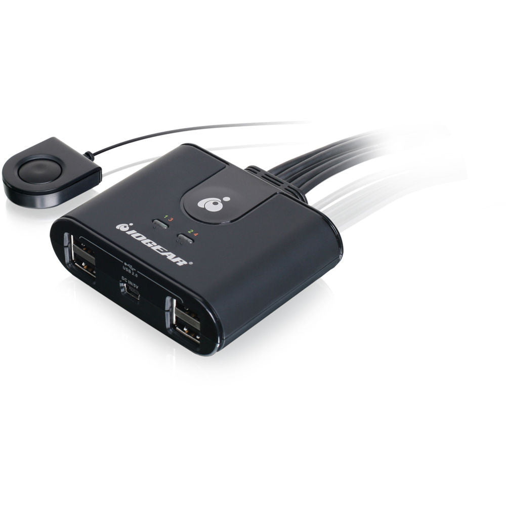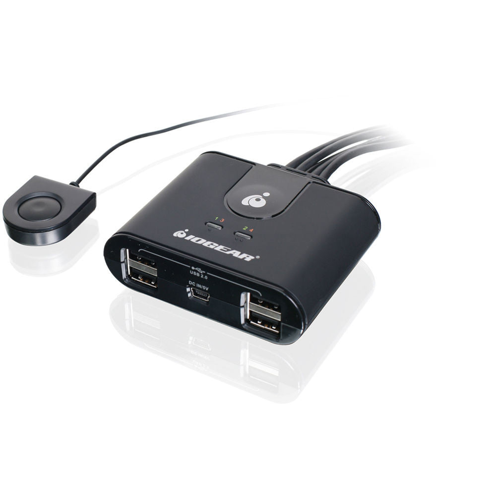 The 4x4 USB 2.0 Peripheral Sharing Switch from IOGEAR allows four computers to share up to four USB peripheral devices. It has four USB ports for connecting peripherals and four built-in cables with USB connectors for connecting to computers. More devices can be supported by adding an optional USB hub.