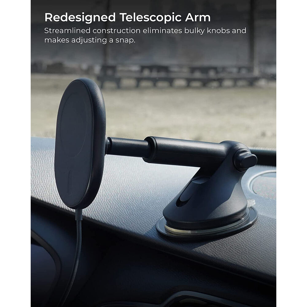 The iOttie Velox Wireless Dash and Windshield Mount is a powerful magnetic wireless charging phone mount designed specifically for MagSafe compatible iPhones and cases. Keep your iPhone accessible in a myriad of custom mounting positions without obstructing your view thanks to the telescopic arm. Plus, a streamlined profile with a friction ring and snap lock makes adjusting the arm quick and hassle-free.