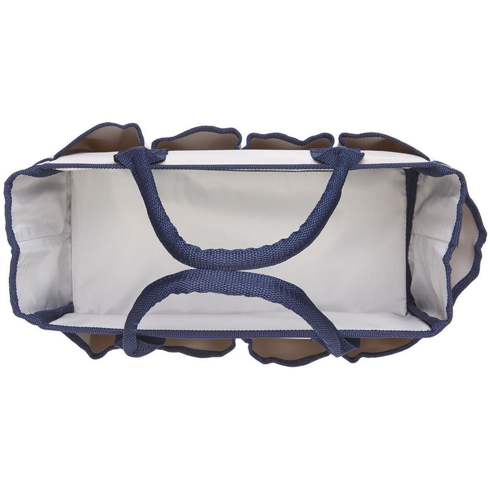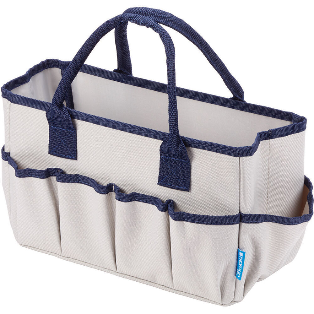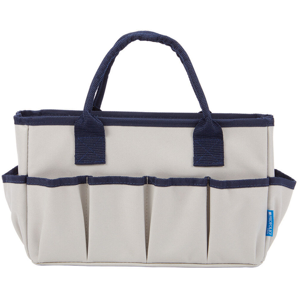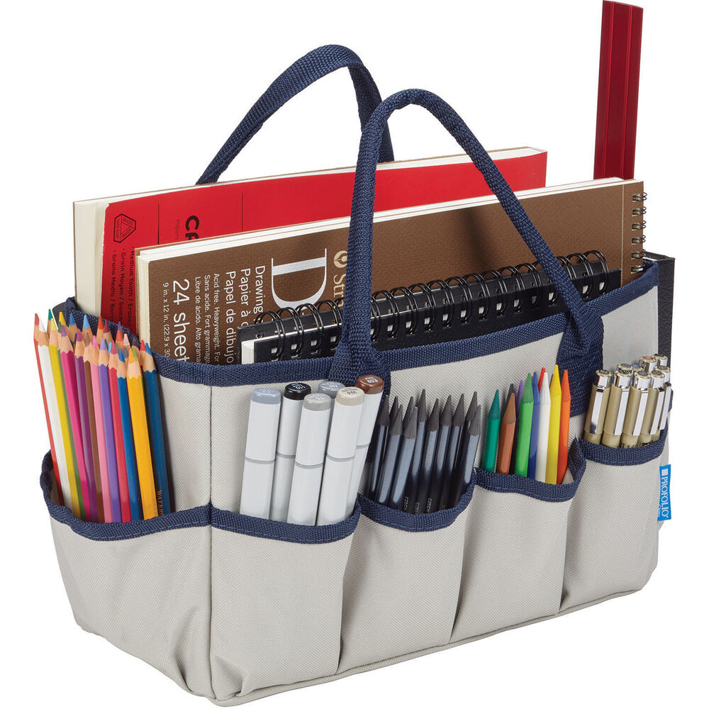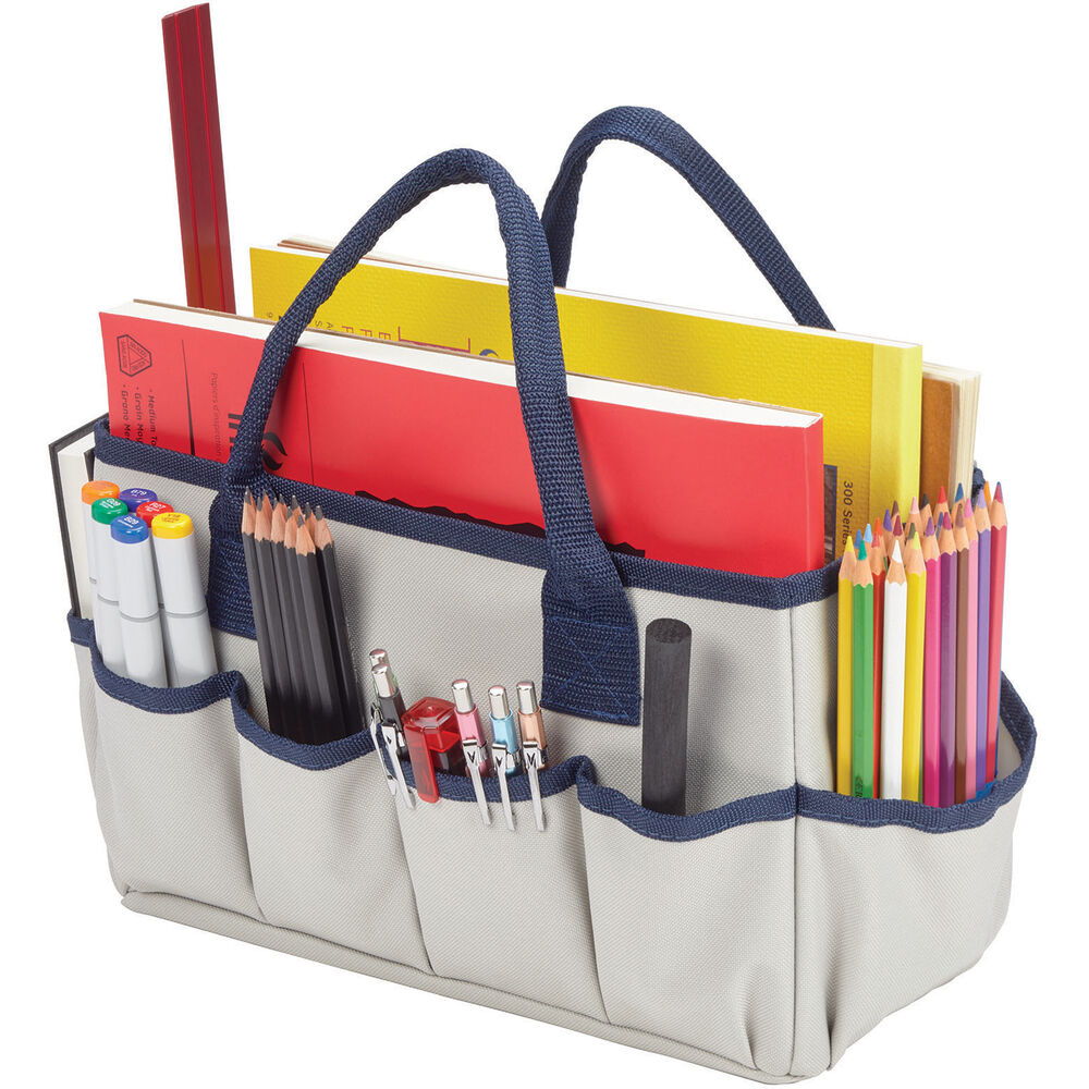 This gray and navy ProFolio Entourage Tote Bag from Itoya measures 12 x 7 x 5.5" and makes a useful carry-all for your markers, brushes, paint tubes, spray cans, sketch pads, photography accessories, and more. Made from durable nylon with reinforced handles, it is extremely sturdy, yet lightweight. The smooth nylon interior is easy to clean, just wipe it down with a wet paper towel. The bag folds flat for easy storage, and has 12 external pockets so you can organize small items.
