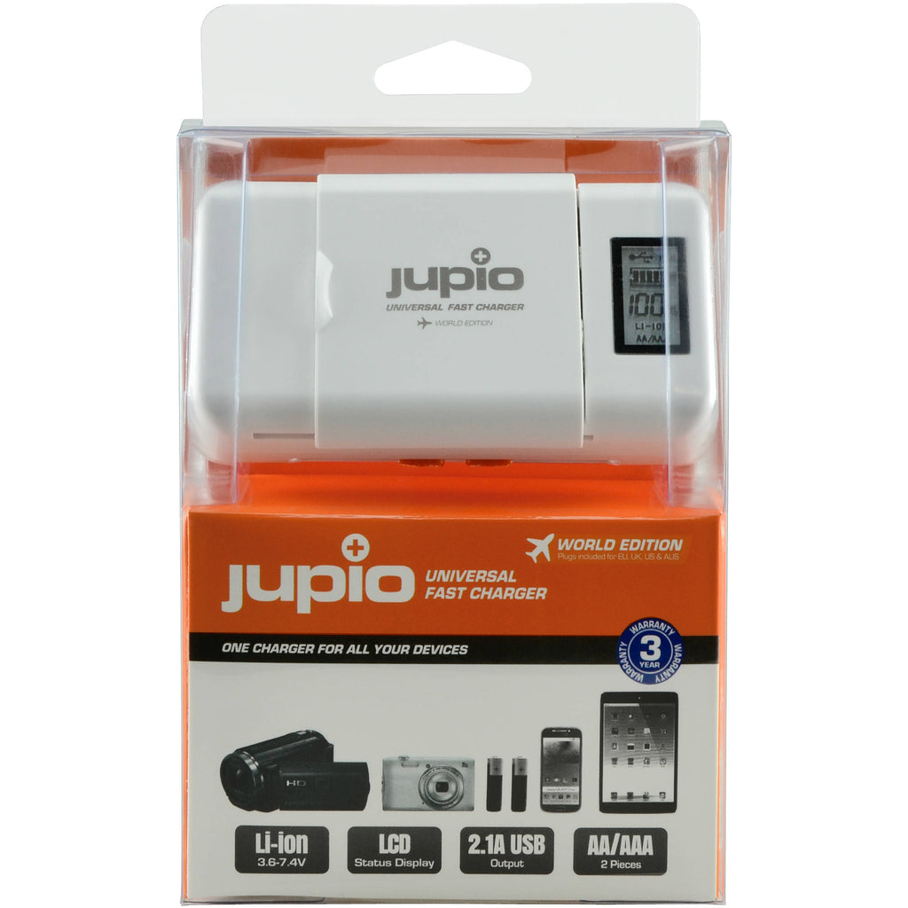 Charge Lithium-Ion Camera BatteriesCharge Two AA or AAA Batteries at a TimeUSB Output Charges Portable DevicesLCD Display Status Display The compact Universal Fast Charger from Jupio is a convenient travel accessory charger for camera batteries and AA and AAA batteries. Featuring multi-voltage input capacity, it is compatible with 3.6/3.7 and 7.2/7.4 VDC lithium-ion polymer (LiPo) and lithium-ion camera and camcorder batteries. It has a dual battery bay for rechargeable AA and AAA batteries and an integrated USB port for charging most portable devices. The LCD display shows the battery and USB device status while charging. Additionally, this compact multi-voltage charger fits easily in a pocket or camera bag and is suitable for world travel.