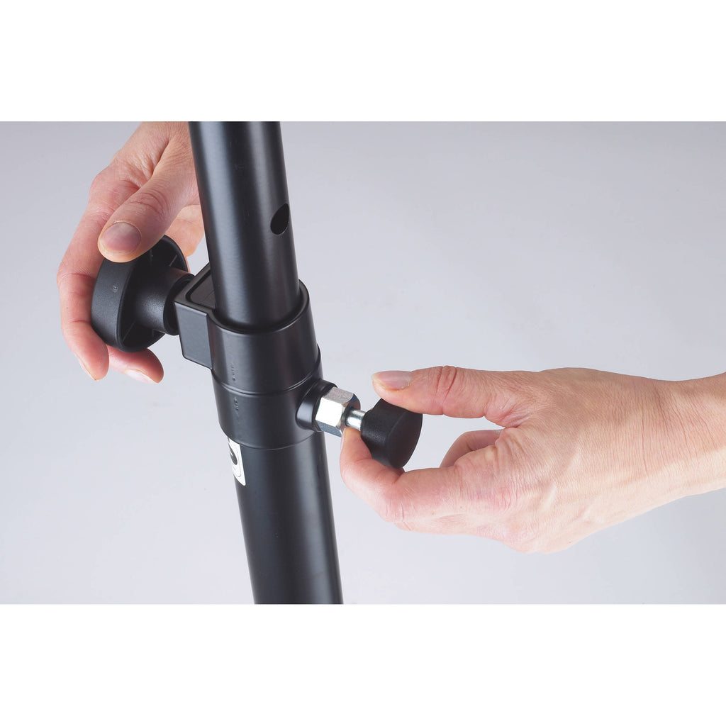 The black 26736 Distance Rod from K&M is a steel tube combination designed to connect satellite systems. It has a bottom M20 thread to attach connector plate 24116. This rod is height adjustable, and has a spring-loaded locking screw and safety bolt.