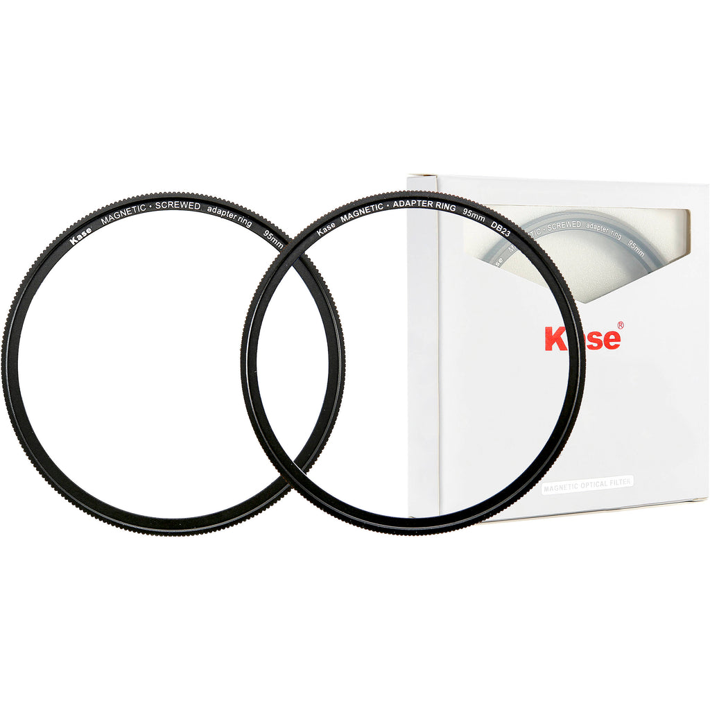 The Kase 95mm DIY Magnetic Screw-In Adapter Ring Kit allows you to convert conventional 95mm screw-in filters to the magnetic type. The kit includes two rings. One ring is magnetic on one side and has 95mm male threading on the other. This ring screws onto your camera lens. The second ring is magnetic on one side and has a 95mm female thread on the other. Screw your filter onto this second ring. Then magnetically mount this second ring onto the first one that's already on the camera lens. Filters heavier than 2 oz, such as certain variable ND filters with brass rings, are not recommended.