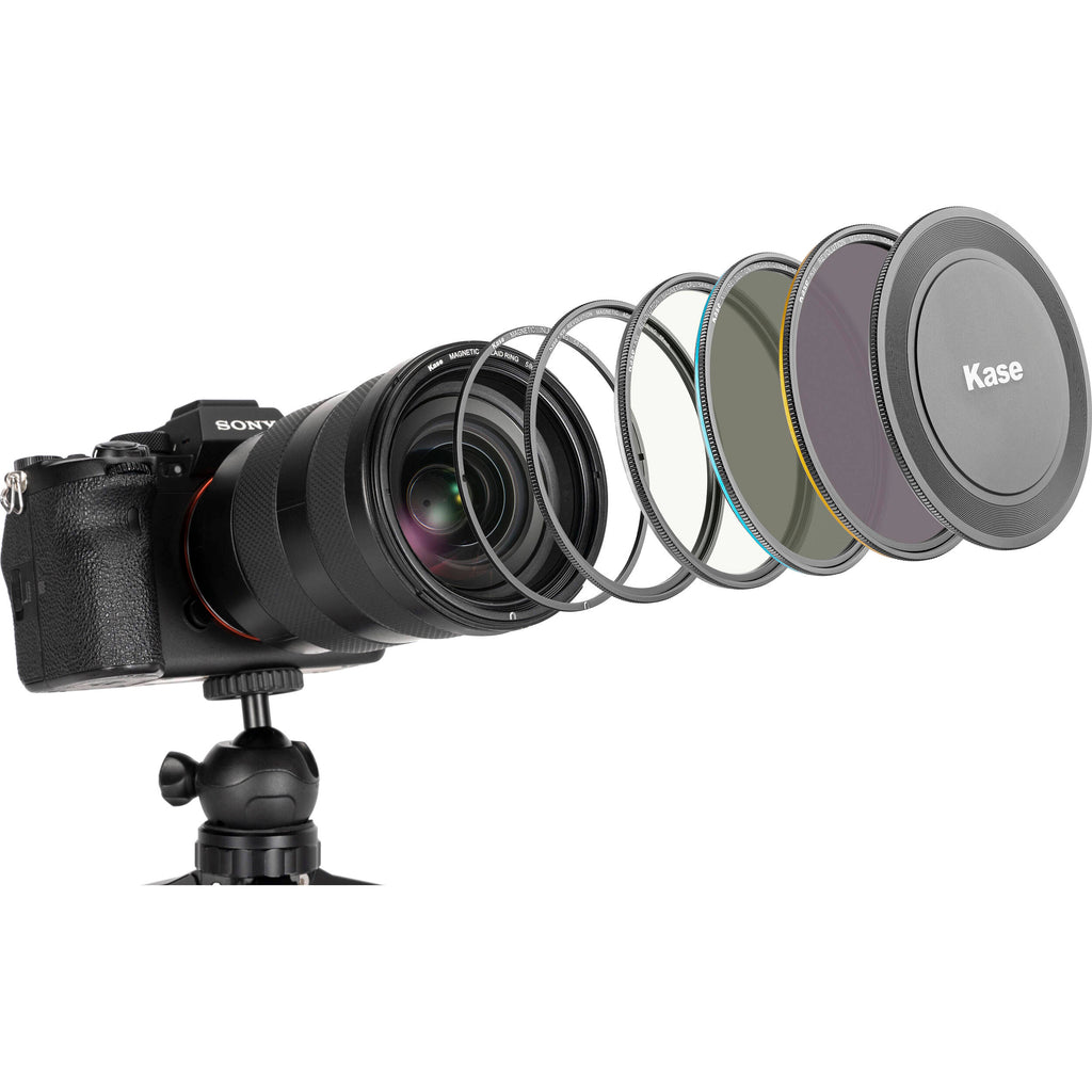 Designed for lenses with a 58mm filter diameter, this Kase KW Revolution Entry Kit includes a circular polarizer, an ND8 filter, an ND64 filter, inlaid magnetic adapter ring, a front lens cap, and a filter pouch to provide you with a basic, starter filter kit. Each filter is made using shock-resistant KW optical glass and color coded for easy identification. The inlaid magnetic adapter ring installs within your lens without adding thickness, allowing you to mount optional traditional adapter rings and lens caps, while also allowing you to mount magnetic filters without using threaded adapter rings. The included circular polarizer features a silver frame, the ND8 has a blue frame, and the ND64 has a yellow frame.