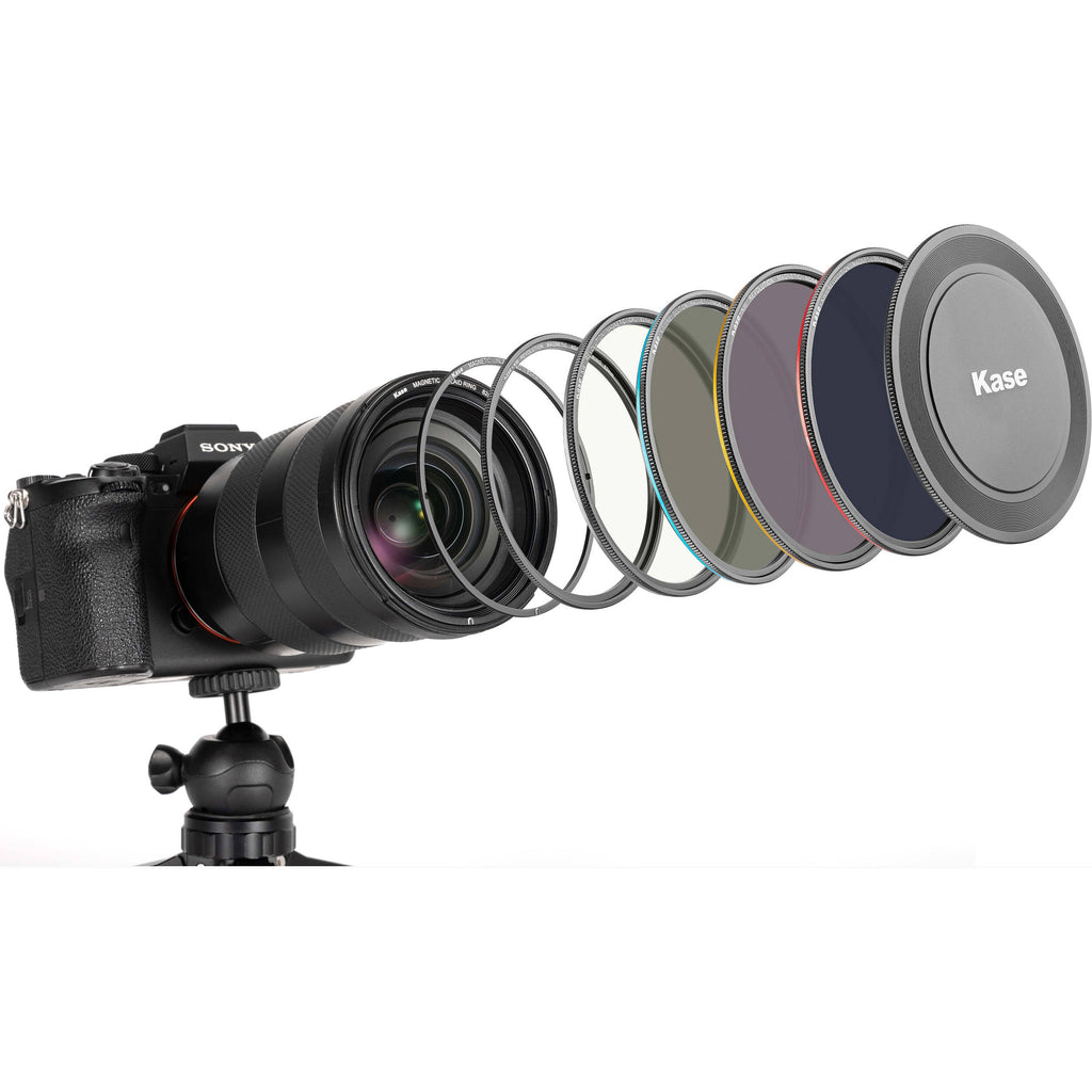 This kit includes both the standard magnetic adapter and the inlaid magnetic adapter supported by the KW Revolution series. The standard one screws onto your lens and lets you magnetically attach the filter to it. But the inlaid adapter works a bit differently. It secures to your lens in a very recessed way. It screws onto the front filter threads very close to the front lens element and nearly hidden within the filter thread area. It hardly leaves any space between the lens and filter. This results in minimized vignetting with wide angle lenses when you attach the filter. The filter snaps onto the adapter magnetically. Up to four filters can be stacked in total, both from this KW Revolution series and from the earlier Wolverine series, and the filters can be freely rotated. Please see more about the inlaid adapter below.