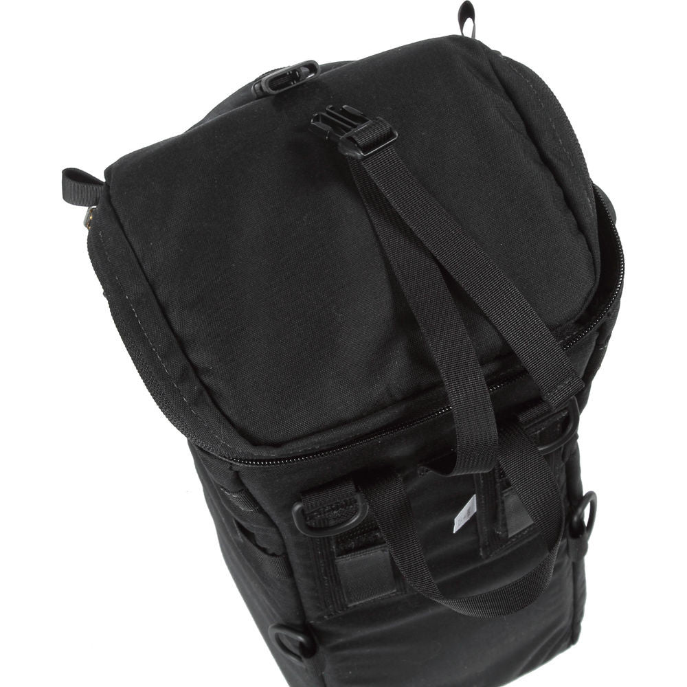 - The outside front pocket will hold a select shoe-mount flash unit or select prime lenses like a 50/1.4 with the hood attached and reversed (it is unpadded so one should exercise caution).