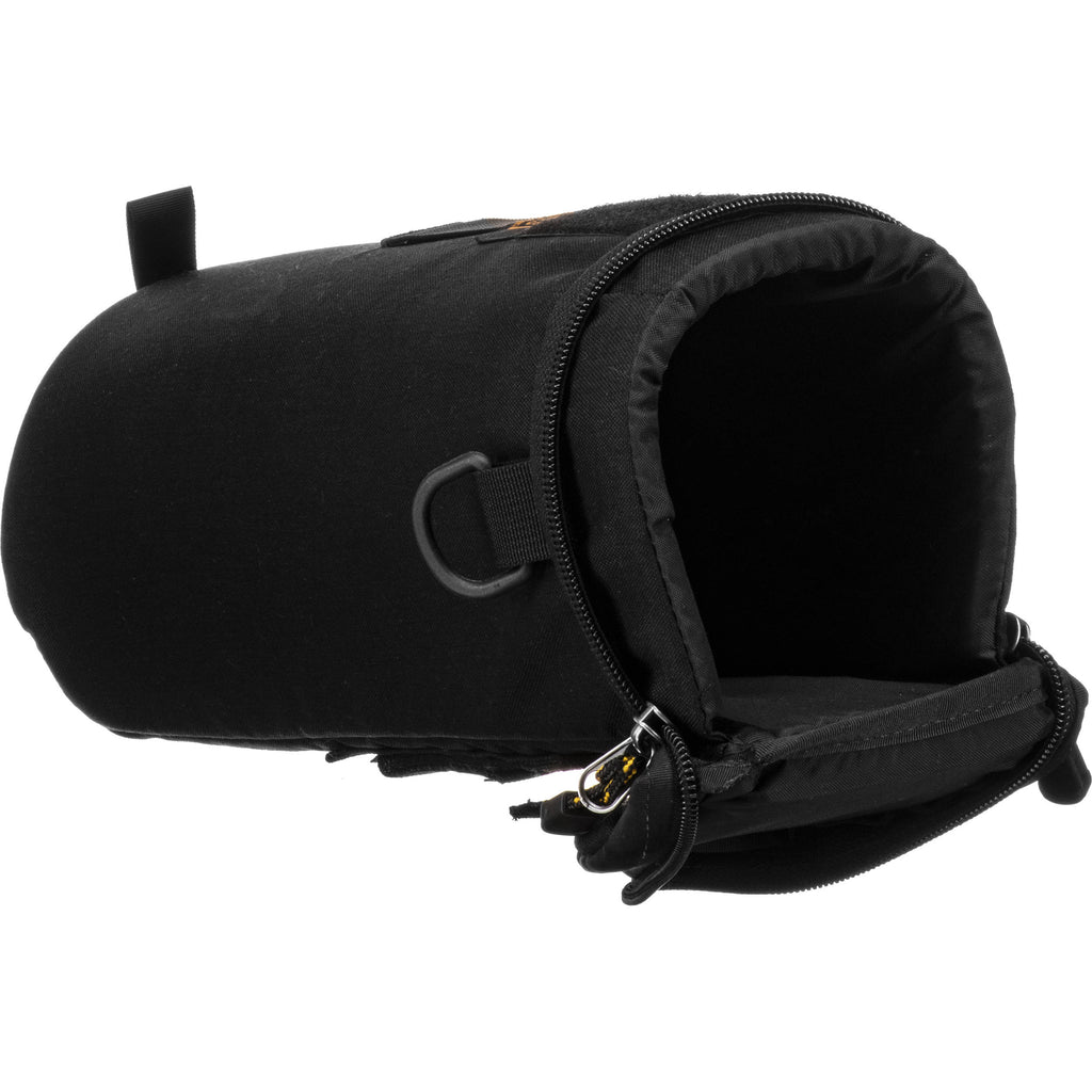 Store, protect, and transport lenses with the black, zippered E340 X-Large Lens Pouch from Kinesis. The E340 X-Large Lens Pouch is designed to hold a 400mm f/5.6 lens or a 70-200mm f/2.8 lens with the hood in the shooting position. For impact and shock protection the pouch has 3/8" (10mm) of closed-cell foam in the sides and bottom, as well as 1/4" (6mm) in the lid. As part of the Kinesis product line, the pouch is compatible with the Kinesis Attachment Tab System (KATS) found on Kinesis belts and larger cases. Built-in D-rings allow for easy attachment to a harness or shoulder strap. Photographers will appreciate the weather-resistant lid and touch-fastening tab for quick access. For strength and durability the exterior of the pouch is constructed with 500D, water-resistant nylon. Carry the pouch by hand, in a larger bag, or with the rear loop.