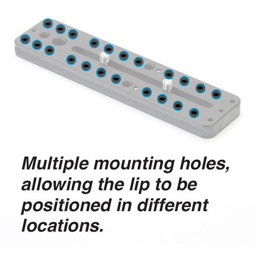 The KLP-625 Quick Release Lens Plate for Select Telephoto Lenses from Kirk is Arca-type compatible with a double-dovetail design. The 6061-T6 aluminum-constructed plate has a black anodized surface and the anti-twist lip is silver anodized, which makes them tough against scratches and scuffs. The lip can be mounted with a 90 or 30° angle, for a snug fit against the tripod collar on the lens, and this feature helps to keep a tighter fit, which prevents the lens foot from pivoting while mounted to the plate. The two 1/4"-20 mountinng screws are used to attach the plate to the lens' tripod foot, and the three additional 1/4"-20 mounting sockets are for optional mounting positions on a tripod. The two integrated safety stops prevent the plate from sliding out if a quick release assembly is accidentally opened, and the industry-standard QD socket allows you to carry the lens with a shoulder or sling strap.