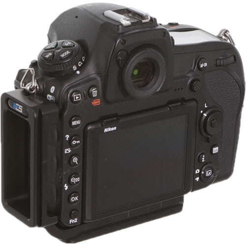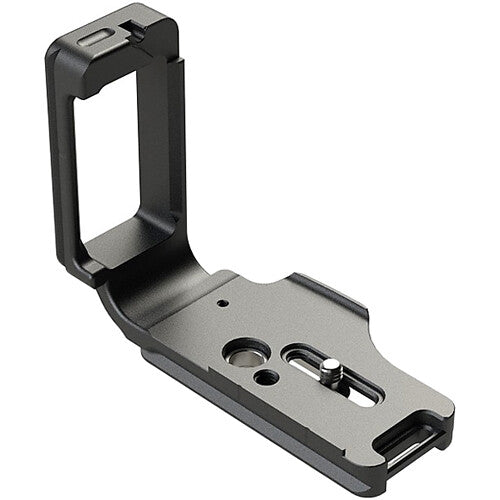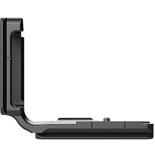 The black anodized 6061-T6 aluminum L-bracket has an open design for side port access and does not block the LCD monitor from tilting. It allows access to controls, ports, and the battery door, and has a hand strap loop machined on the right-hand side. The base incorporates a stainless steel QD (Quick Disconnect) System receiver for a sling or shoulder strap. The included hex wrench is used to tighten the L-bracket to the body and then can stored via the built-in magnetic hex wrench storage system.