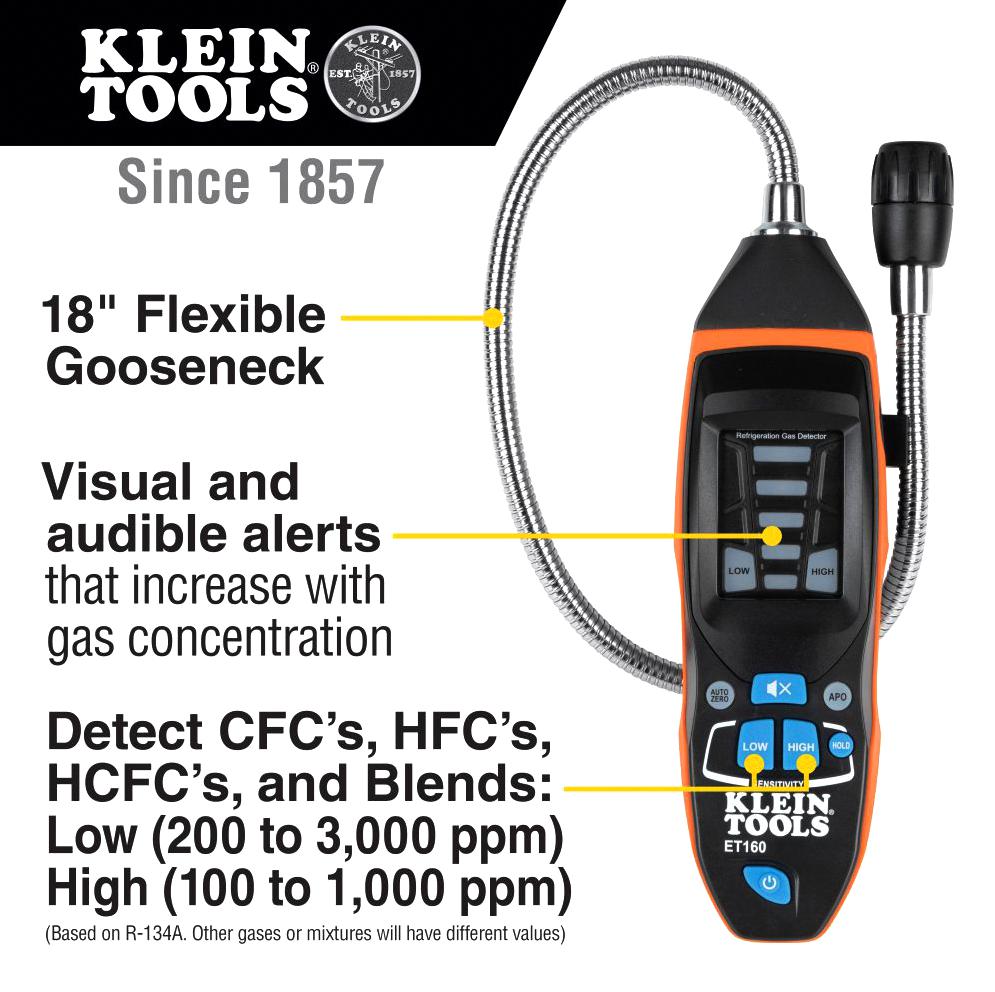 ET160 is an easy-to-use refrigerant gas leak detector that provides audible and visual alarms in the presence of CFCs, HFCs, HCFCs and blends. Detect as low as 100 ppm of common refrigerant gases. Features automatic zero-point calibration, hold, mute and low battery indicator.