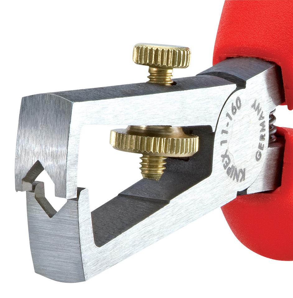 For single, multiple and fine stranded conductors with plastic or rubber insulation up to 5.0 mm dia. or 10 mm² cable cross-section. Easy adjustment to the required diameter of solid or stranded wire with knurled screw and lock nut. Special tool steel, forged, oil-hardened. Pliers with integrated, insulated tether attachment point for a tool tether.
