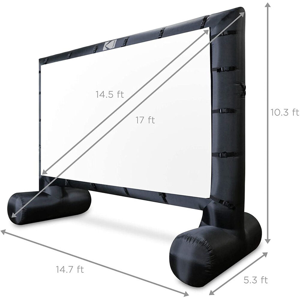 The 17' Inflatable Projector Screen from Kodak sets up quickly and easily for outdoor, large screen viewing at home. This inflatable screen features a detachable white surface, a 17' diagonal viewing area, and tie-downs to secure the screen in windy conditions. This screen fully inflates in minutes using the included electric blower and comes with a carrying bag.