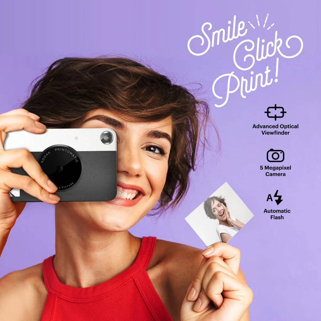 Combining the fun of instant prints with the convenience of digital, this PRINTOMATIC digital camera produces instant prints with separately available Kodak 2 x 3" ZINK photo paper. The camera has a 5MP image sensor and a wide-angle f/2 lens for recording digital images that you can save to your microS card or make 2 x 3" prints for sharing.