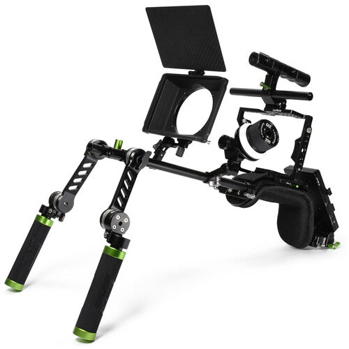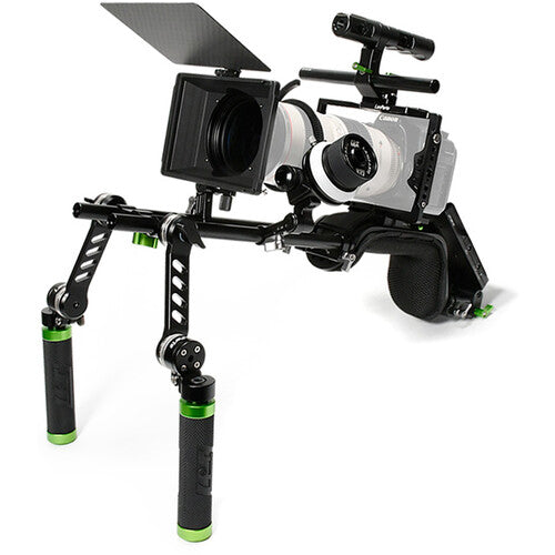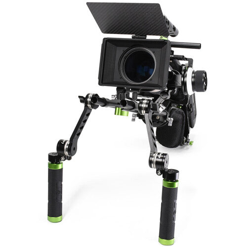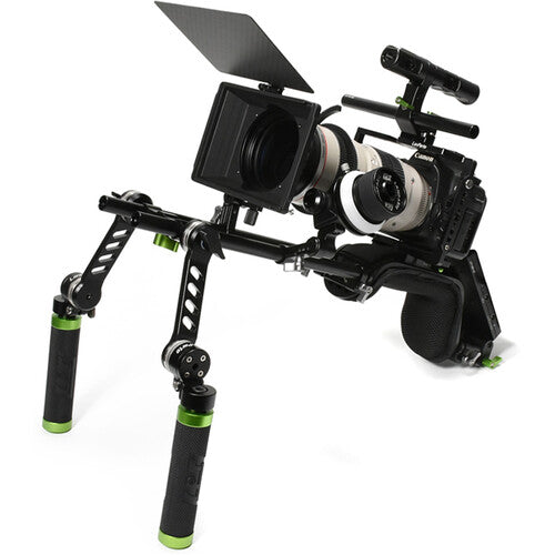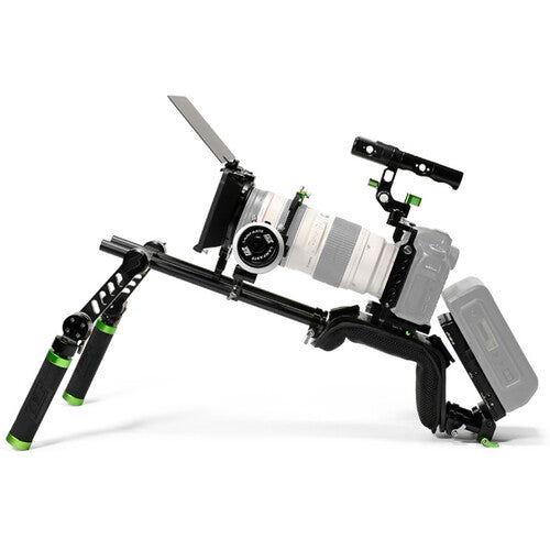 Your camera mounts onto the camera cage and provides a variety of mounting points and protection while keeping the ports, battery door, and display on your camera open. The top handle mounts on top of the cage and provides a single, 7.9" horizontal 15mm rod for additional mounting options. The cage mounts onto the shoulder support that features a soft shoulder pad. This assembly mounts onto the central 11.8" 15mm rods, as do the shoulder mount, follow focus, matte box, and dual handgrips.