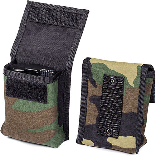 The forest green camouflage BatteryPouch Pro DSLR 1+1 from LensCoat consists of two pouches that each hold one lithium-ion battery. Both pouches snap together to hold the batteries for easy storage and retrieval. Each pouch seals with a touch fastener. When not utilized, they fold flat for storage within your gear bag or luggage.