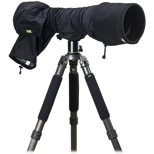 The RainCoat is constructed of waterproof and breathable poly tricot and is adorned with a useful camouflage pattern - so if you're a nature shooter, the additional concealment aspect to it will be of great value. All the seams are tape sealed. Even with all its protection, you will not need an accessory eye piece to look through the camera. The RainCoat fits on easily and is secured via rugged cinch straps that permit full adjustment of the length. The straps also permit you to keep the coat tight-fitted around your lens. The handy fold-out arm sleeve allows you to stick your hand in and control the camera. There's also a rear opening through which the camera is accessible and that is secured using a hook and loop closure.